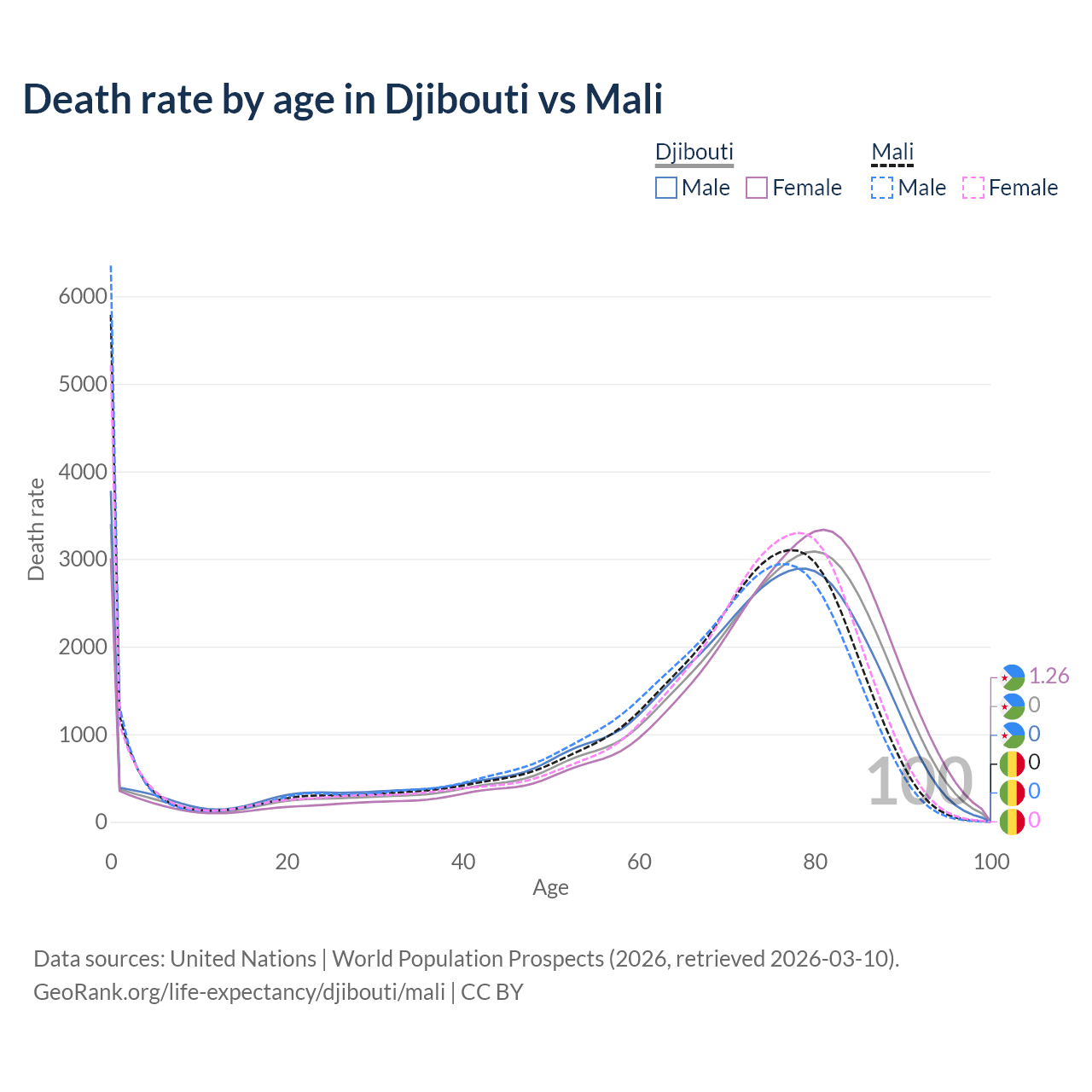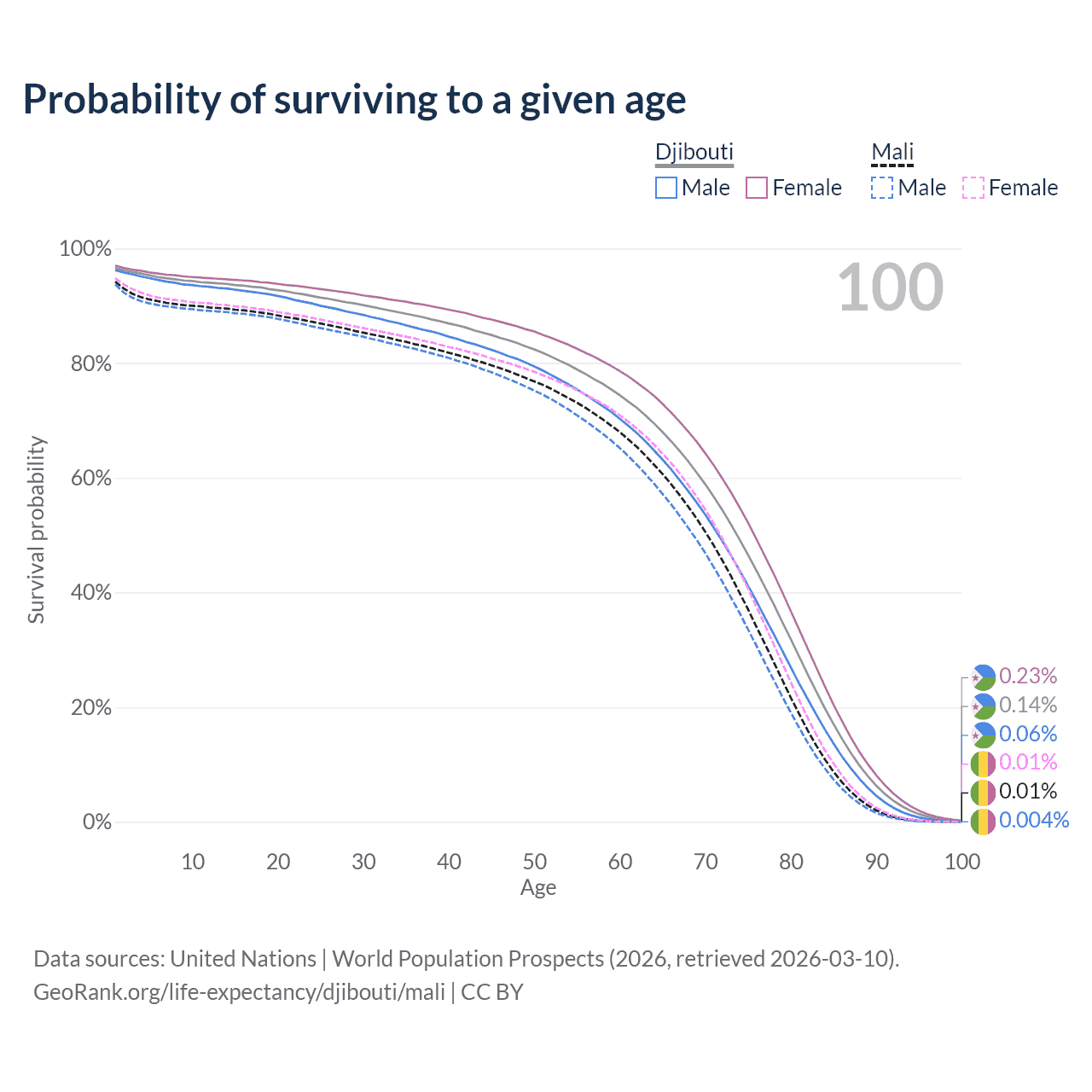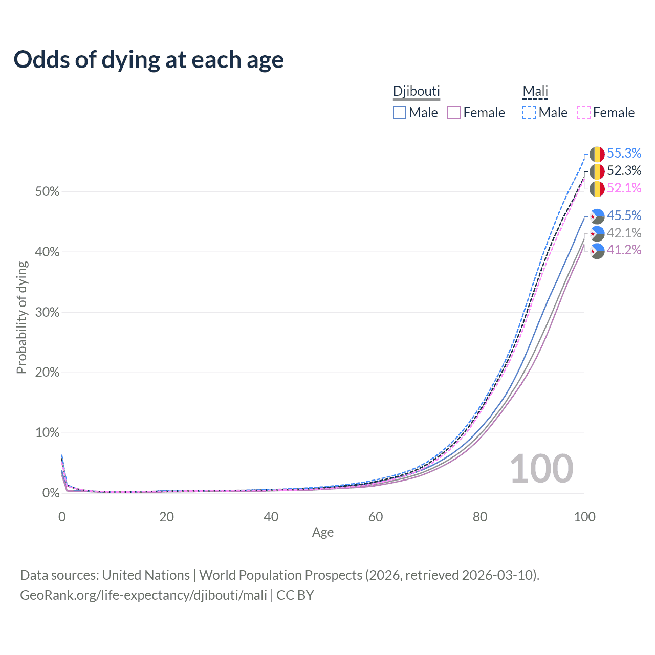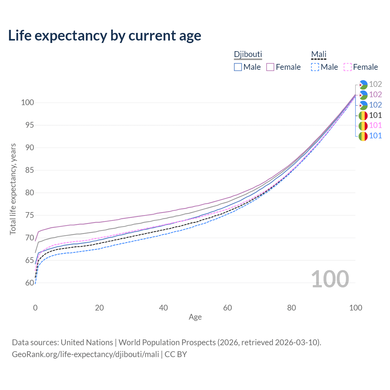 This life expectancy calculator shows the odds of living to 100, 95, 90, and below based on current age for both males and females in Djibouti and Mali, along with mean and median age of death. The calculations are based on the 2026 life tables (actuarial tables) from the UN World Population Prospects.