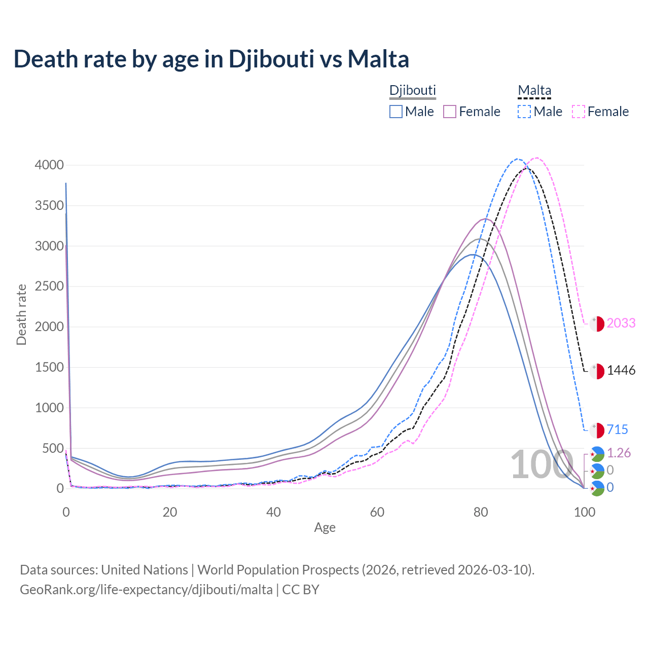 In Djibouti, the most common age of death is 0, compared to 89 in Malta. The median age of death is 73.7 in Djibouti and 86.3 in Malta, meaning only half of each cohort is expected to live past that age.