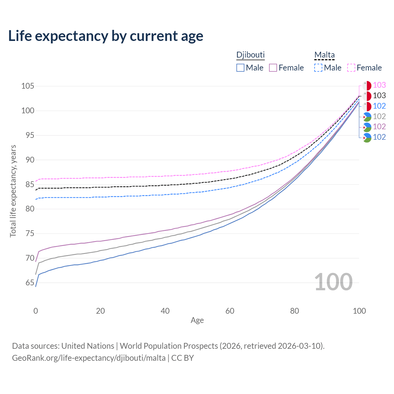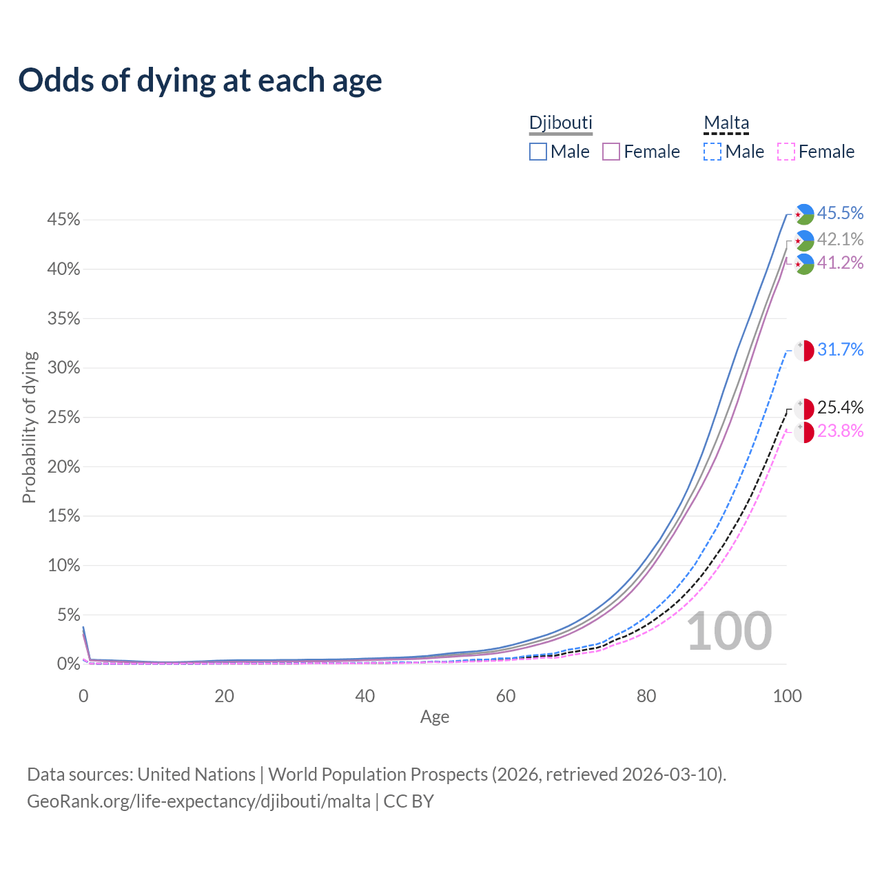 This life expectancy calculator shows the odds of living to 100, 95, 90, and below based on current age for both males and females in Djibouti and Malta, along with mean and median age of death. The calculations are based on the 2026 life tables (actuarial tables) from the UN World Population Prospects.