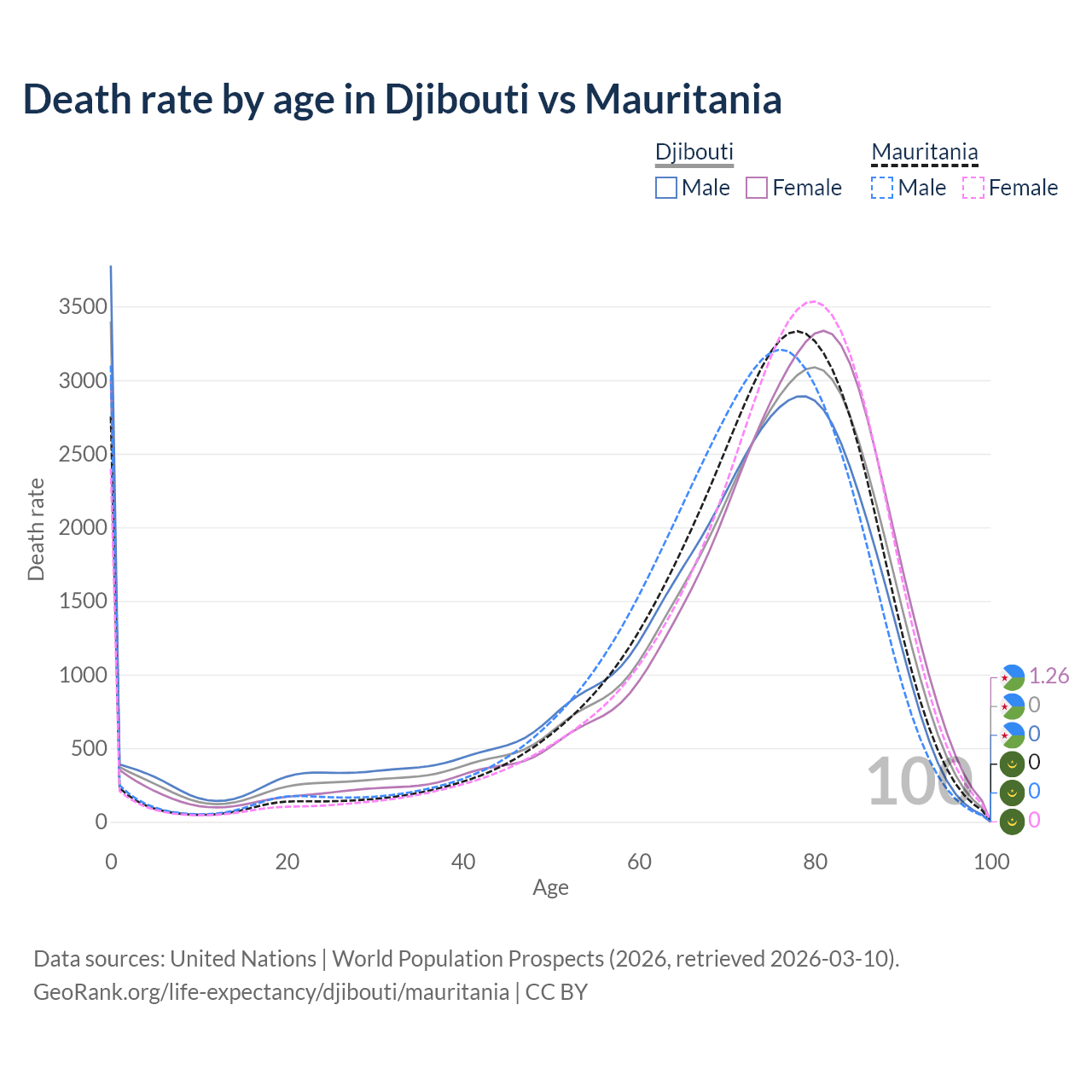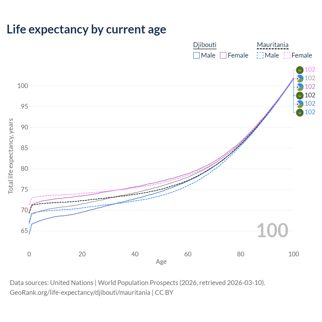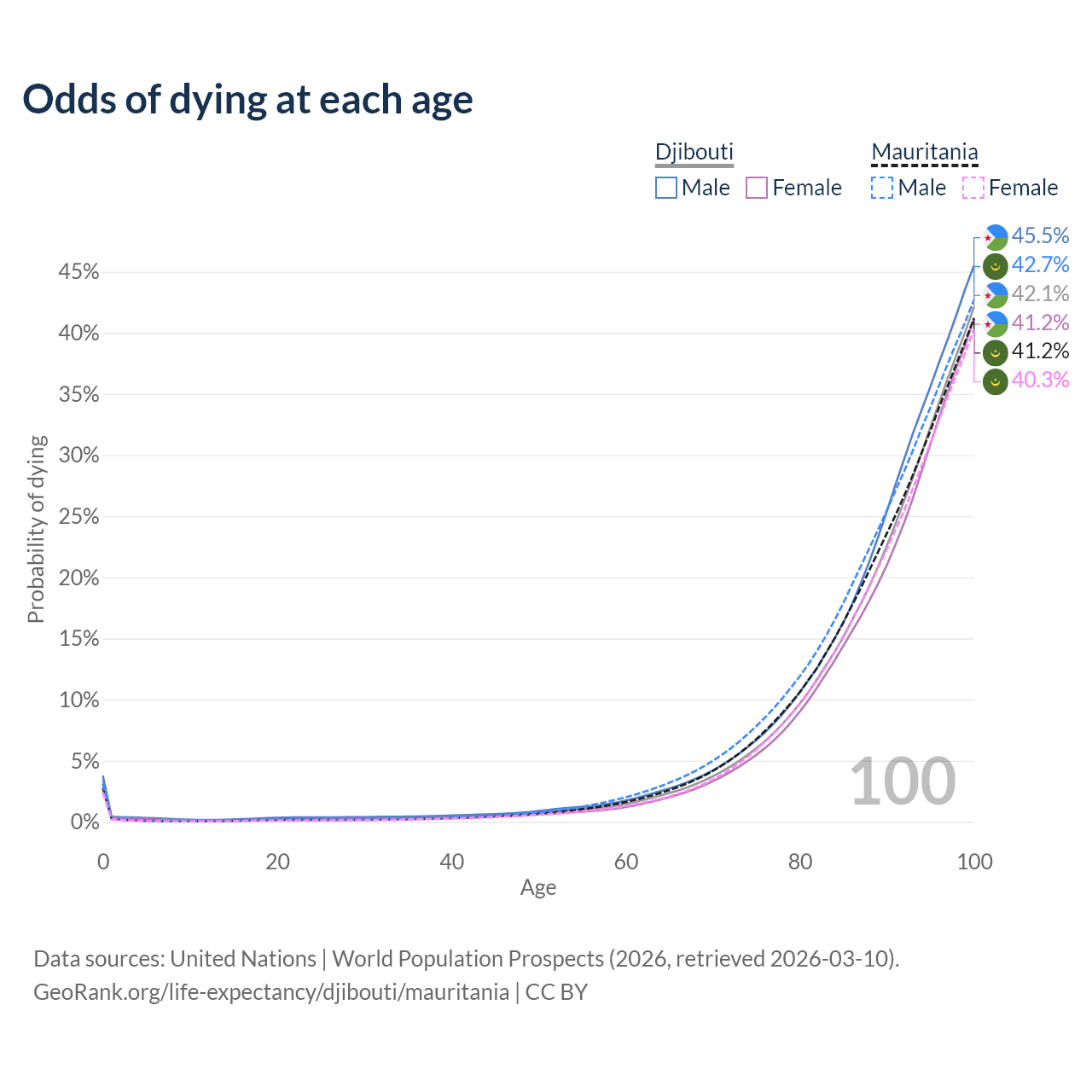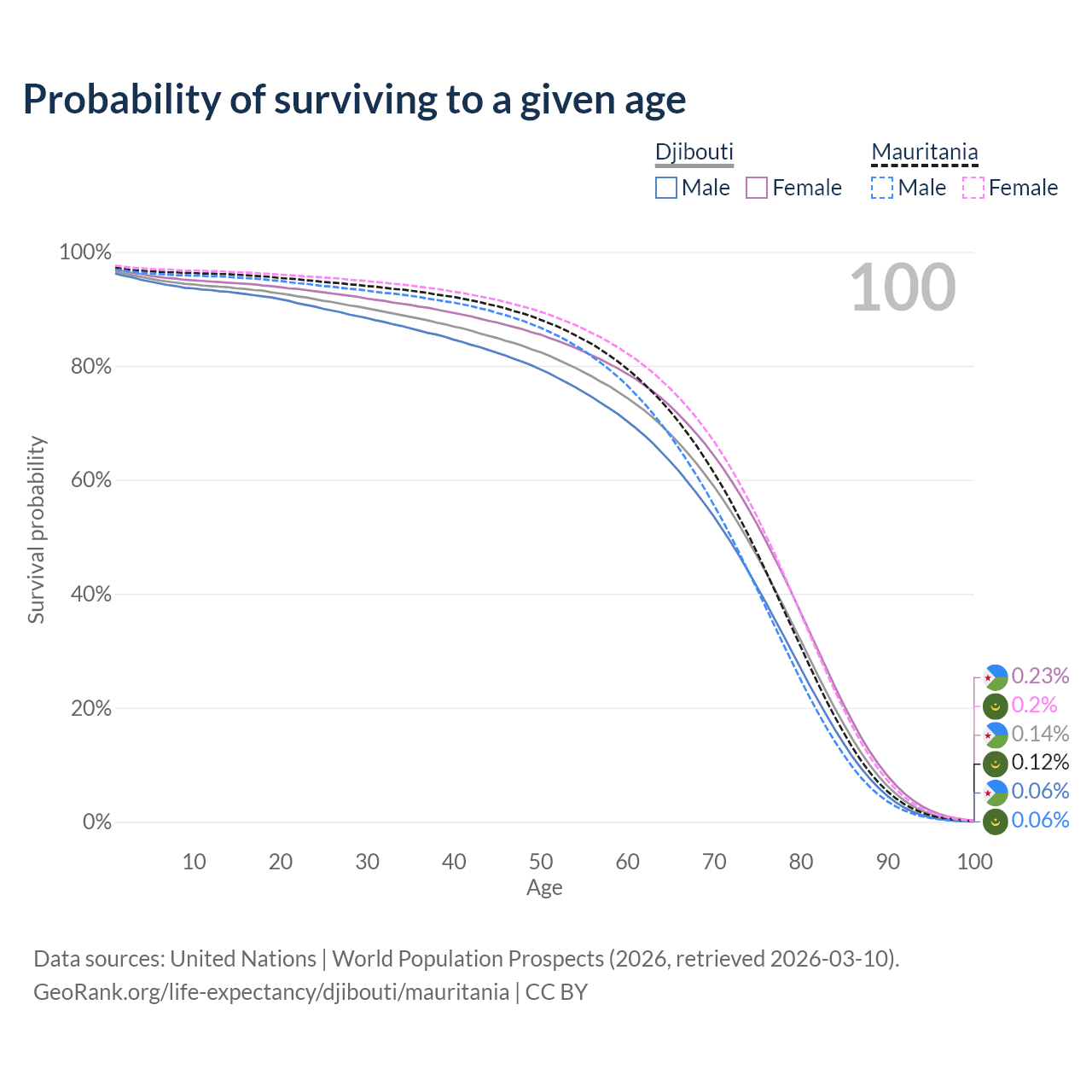 This life expectancy calculator shows the odds of living to 100, 95, 90, and below based on current age for both males and females in Djibouti and Mauritania, along with mean and median age of death. The calculations are based on the 2026 life tables (actuarial tables) from the UN World Population Prospects.