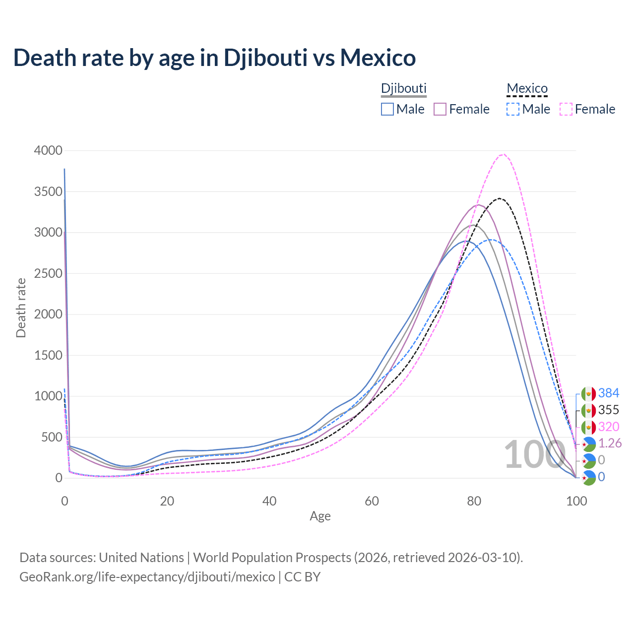 In Djibouti, the most common age of death is 0, compared to 85 in Mexico. The median age of death is 73.7 in Djibouti and 80.1 in Mexico, meaning only half of each cohort is expected to live past that age.