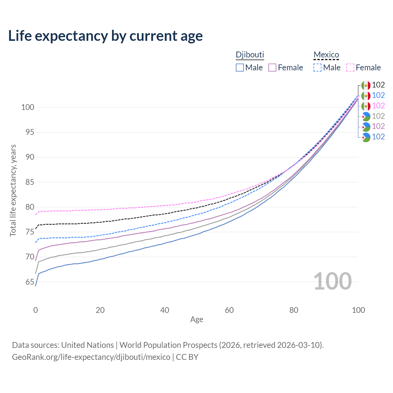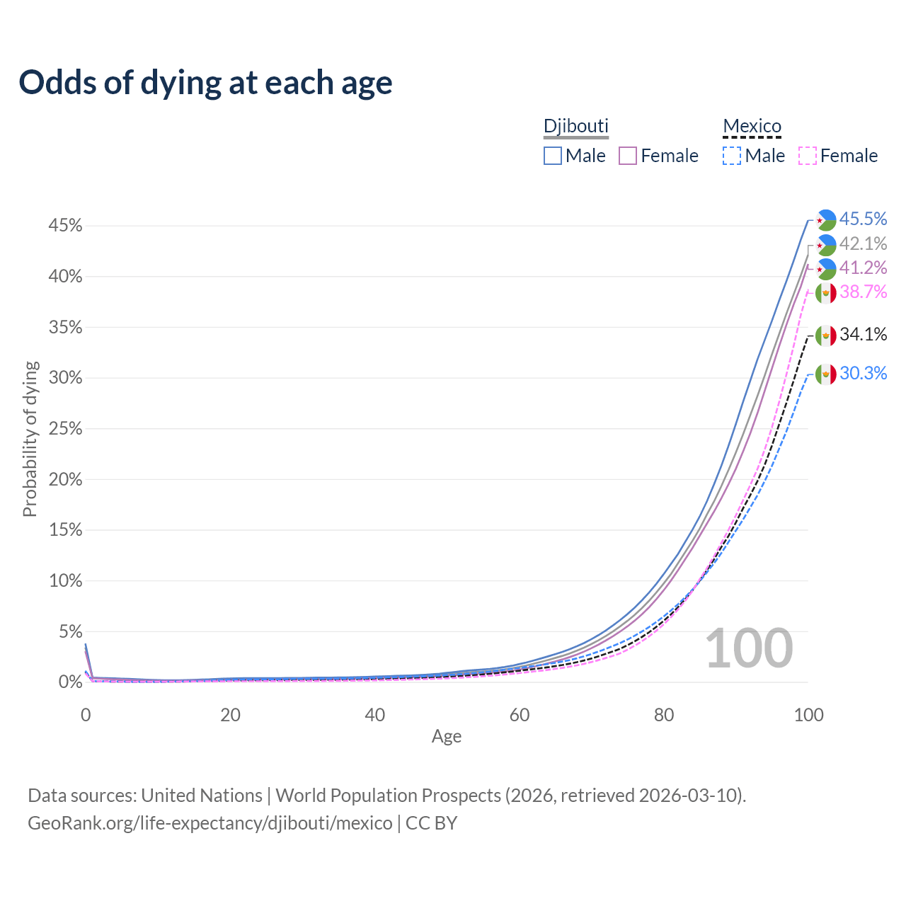 This life expectancy calculator shows the odds of living to 100, 95, 90, and below based on current age for both males and females in Djibouti and Mexico, along with mean and median age of death. The calculations are based on the 2026 life tables (actuarial tables) from the UN World Population Prospects.