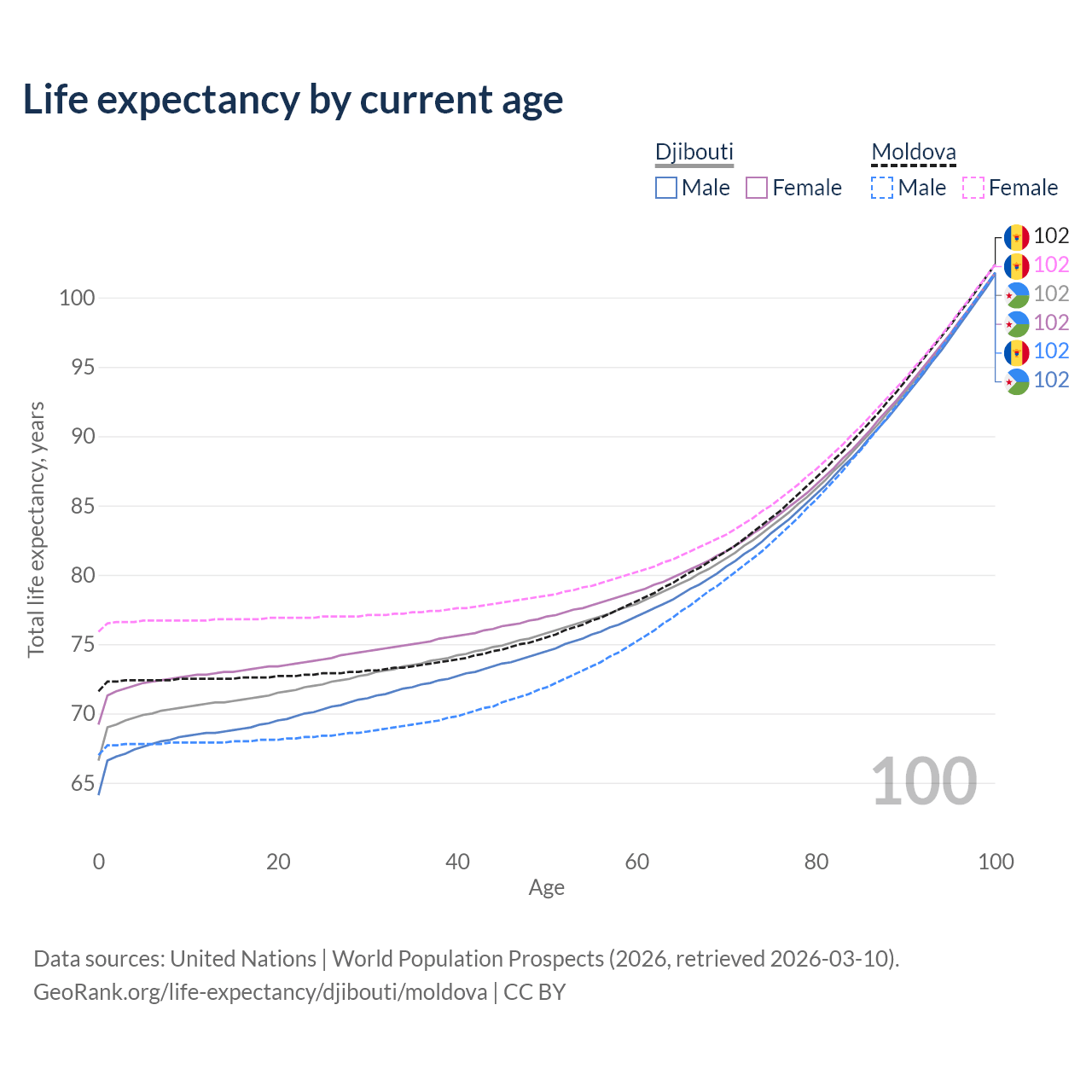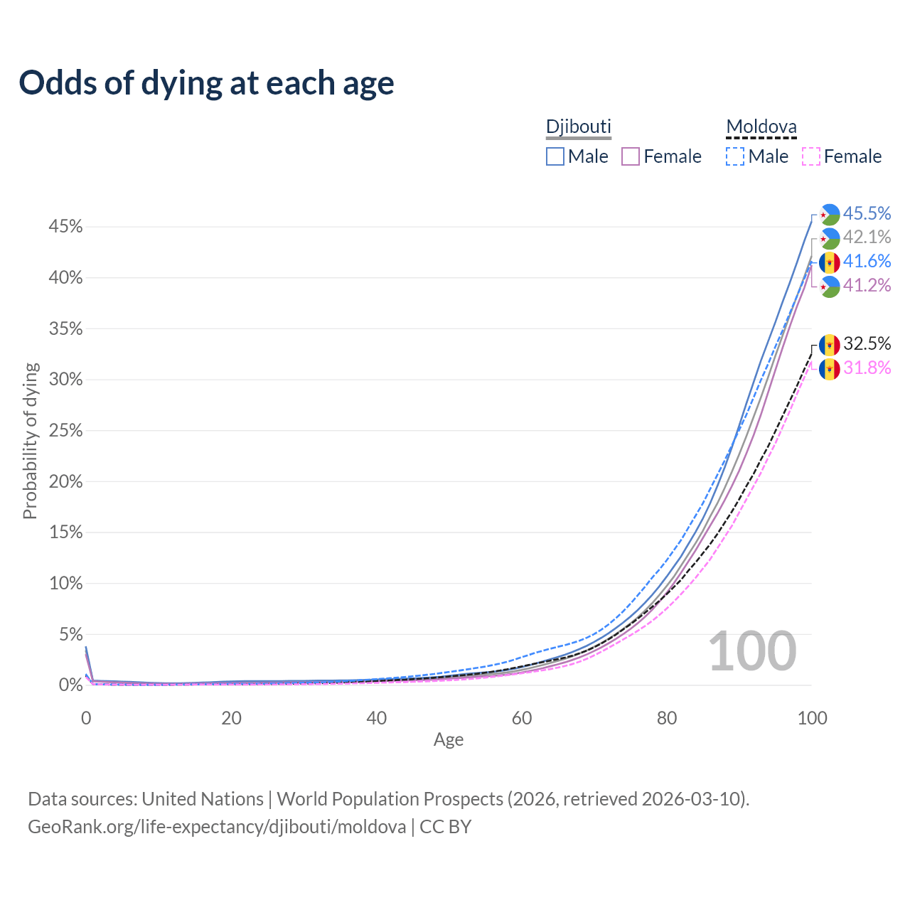 This life expectancy calculator shows the odds of living to 100, 95, 90, and below based on current age for both males and females in Djibouti and Moldova, along with mean and median age of death. The calculations are based on the 2026 life tables (actuarial tables) from the UN World Population Prospects.