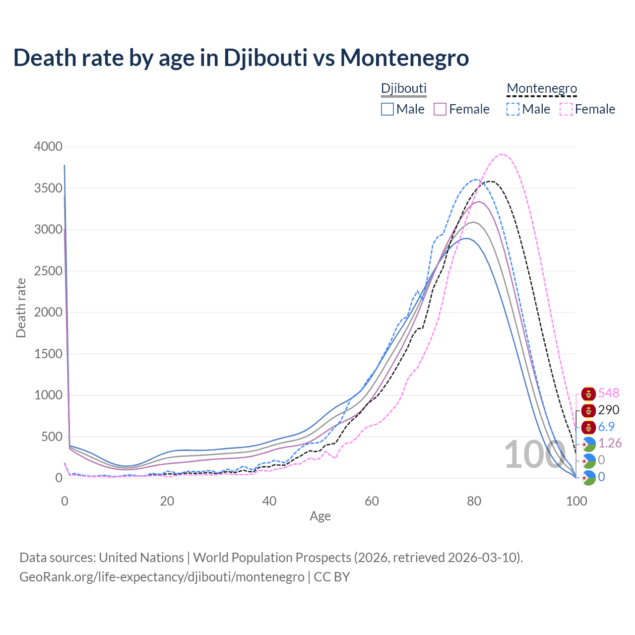In Djibouti, the most common age of death is 0, compared to 83 in Montenegro. The median age of death is 73.7 in Djibouti and 80.1 in Montenegro, meaning only half of each cohort is expected to live past that age.