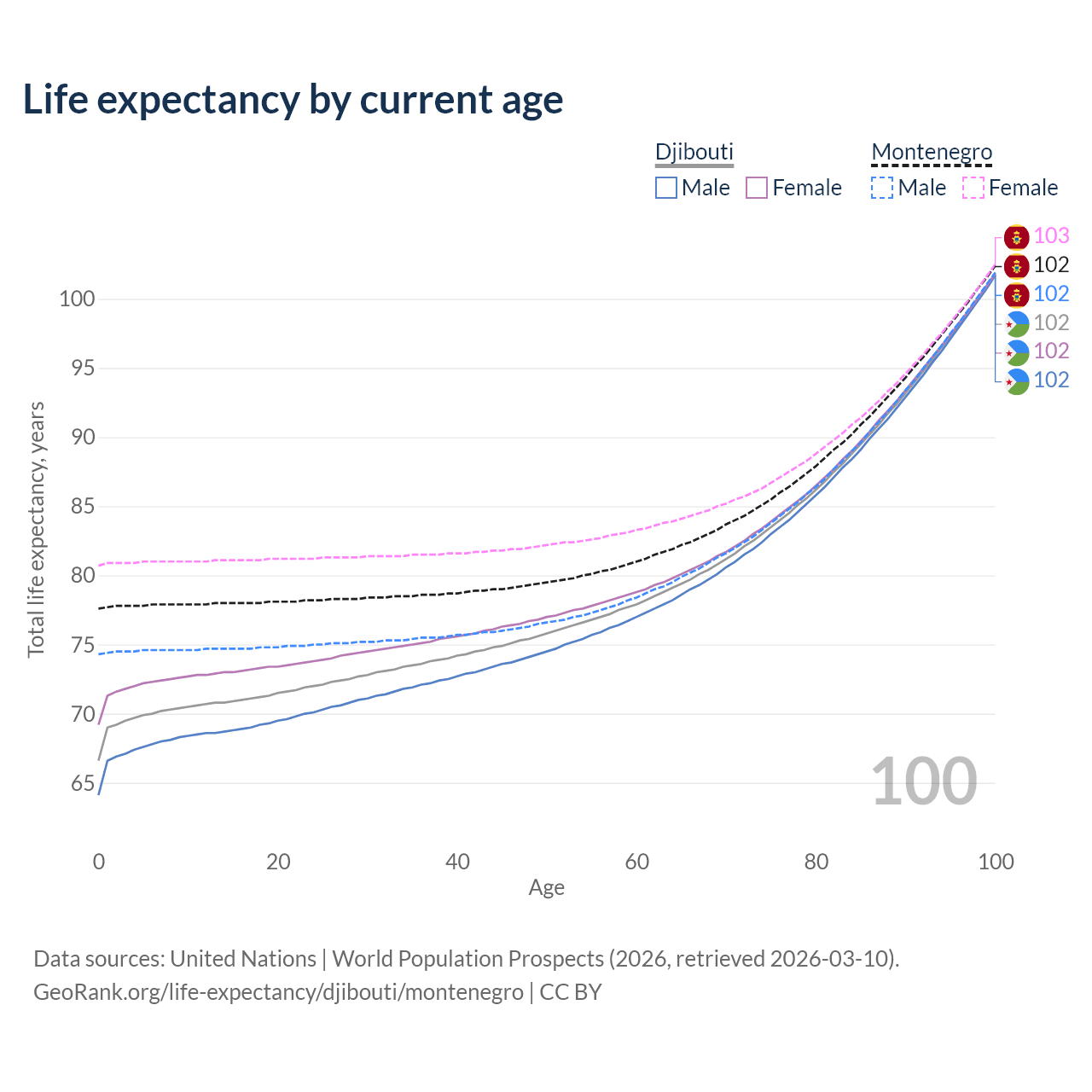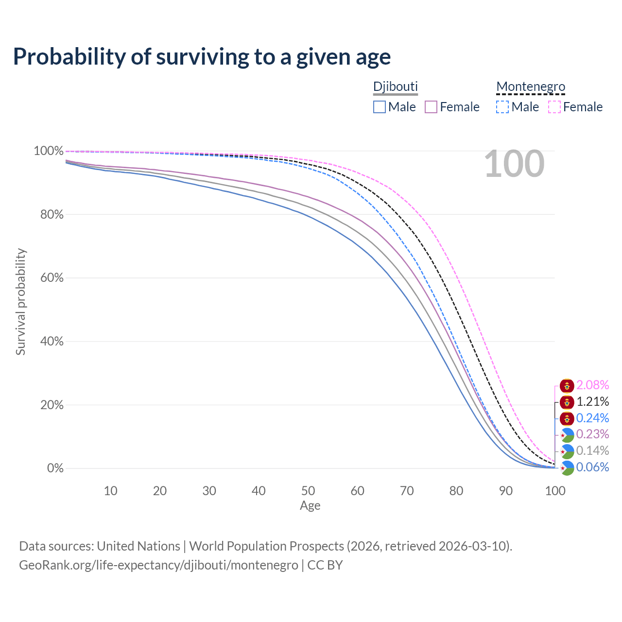 This life expectancy calculator shows the odds of living to 100, 95, 90, and below based on current age for both males and females in Djibouti and Montenegro, along with mean and median age of death. The calculations are based on the 2026 life tables (actuarial tables) from the UN World Population Prospects.