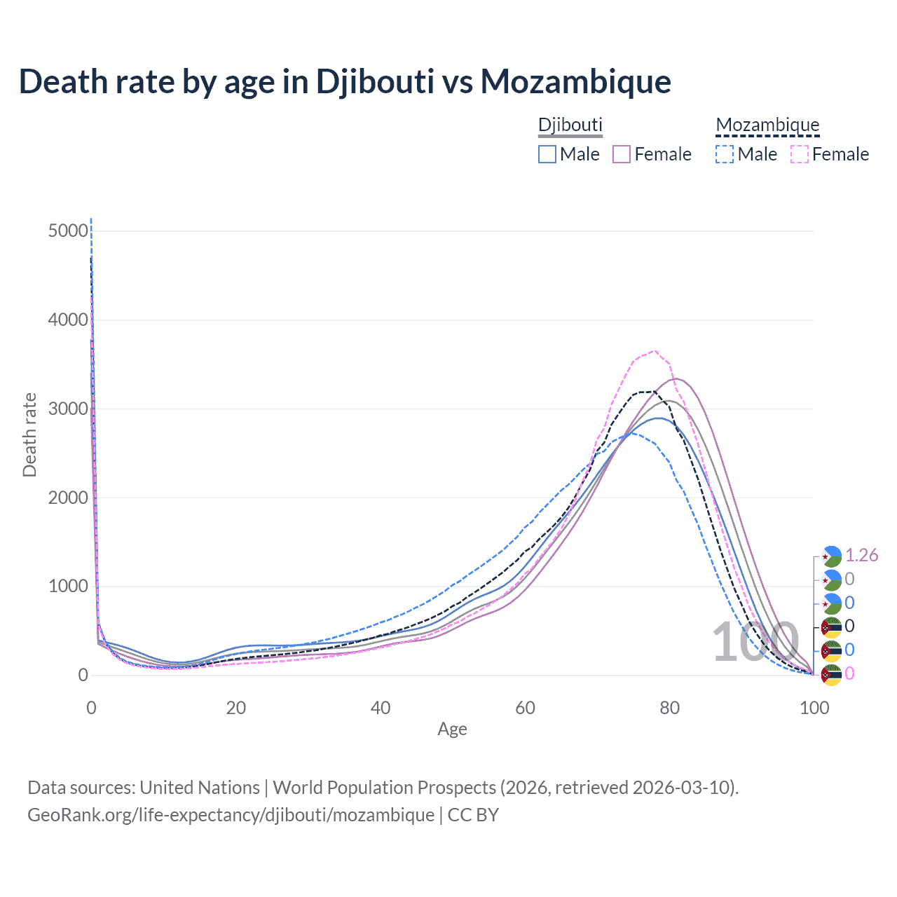 In Djibouti, the most common age of death is 0, compared to 0 in Mozambique. The median age of death is 73.7 in Djibouti and 71.2 in Mozambique, meaning only half of each cohort is expected to live past that age.