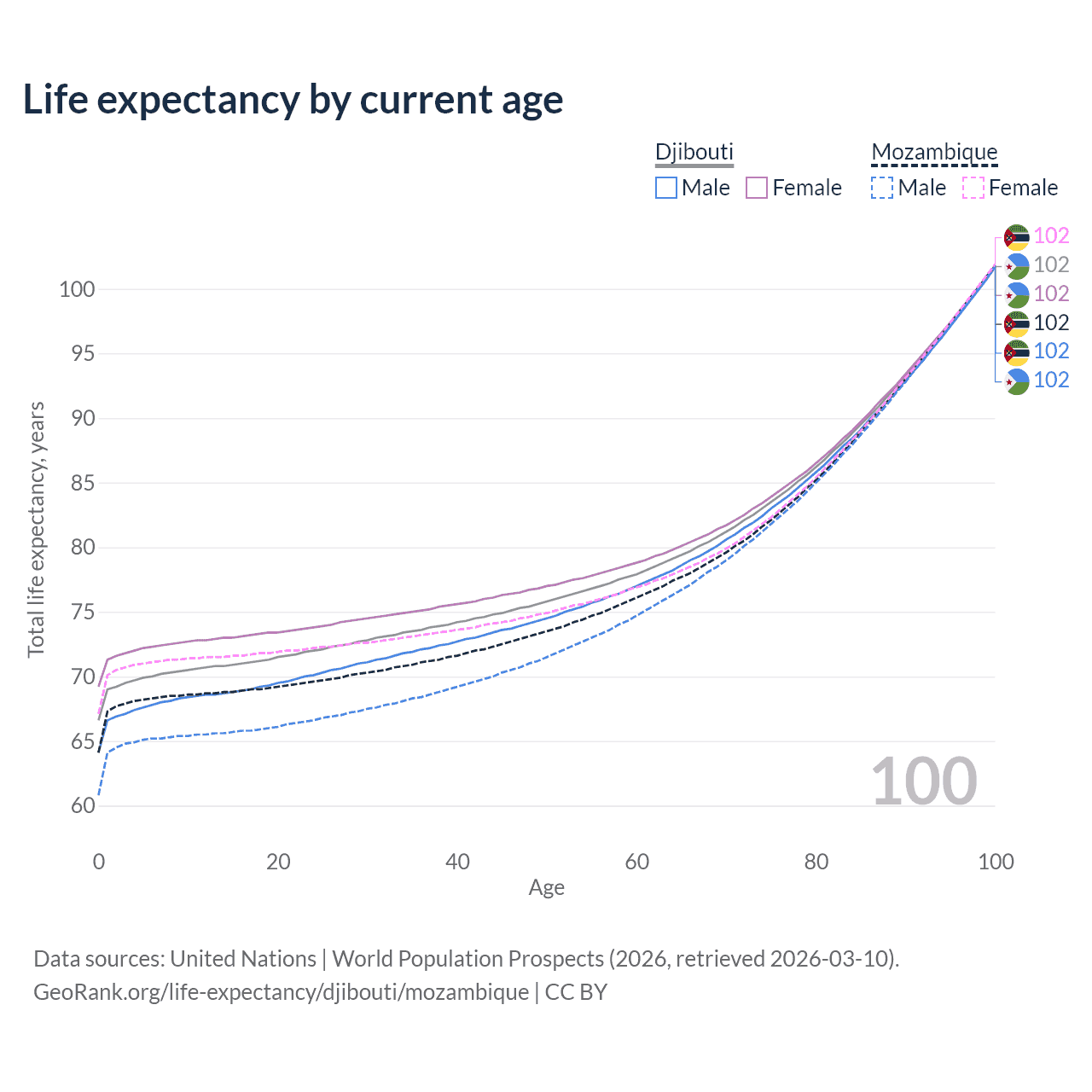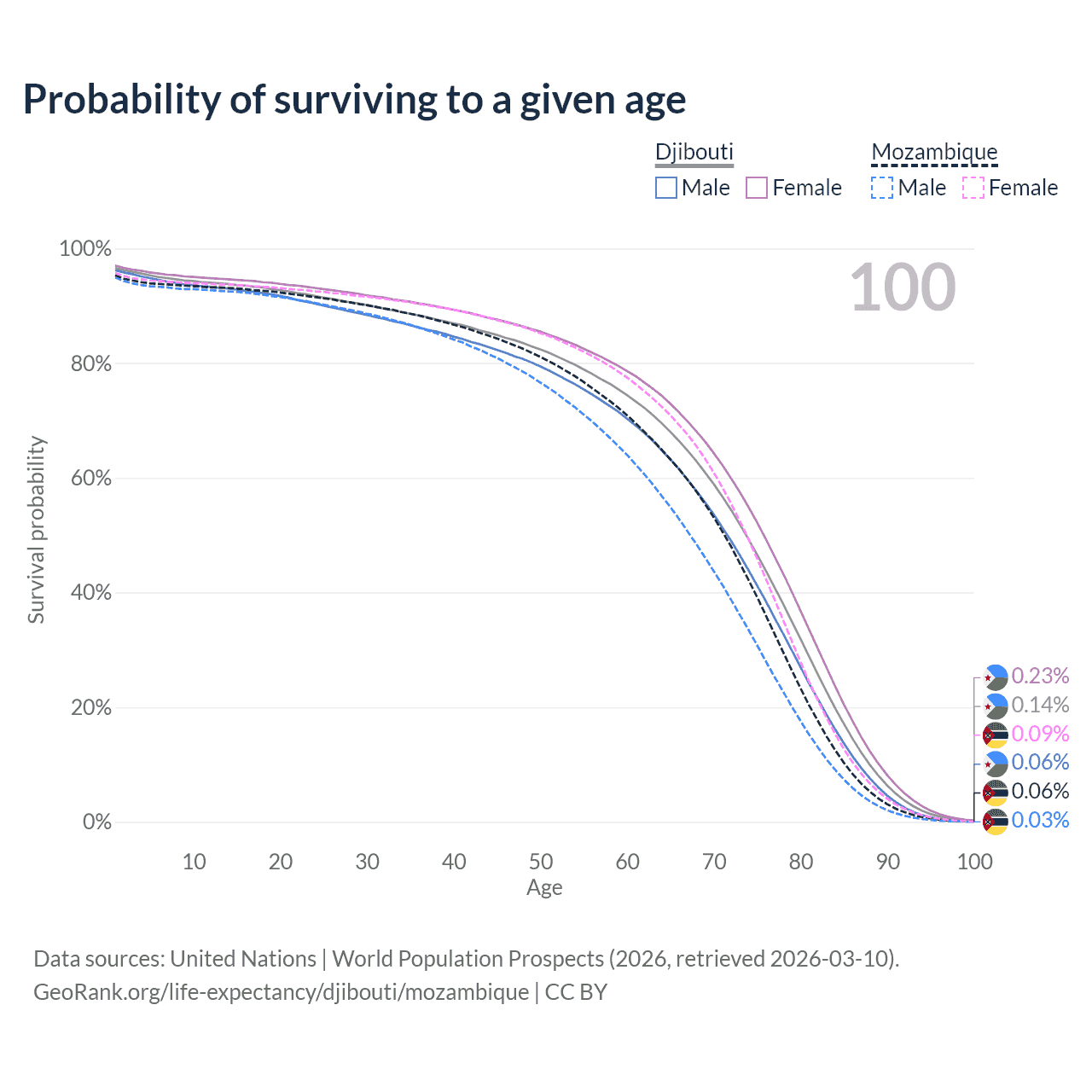 This life expectancy calculator shows the odds of living to 100, 95, 90, and below based on current age for both males and females in Djibouti and Mozambique, along with mean and median age of death. The calculations are based on the 2026 life tables (actuarial tables) from the UN World Population Prospects.