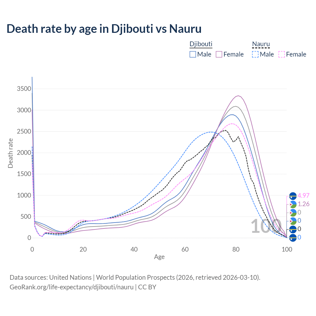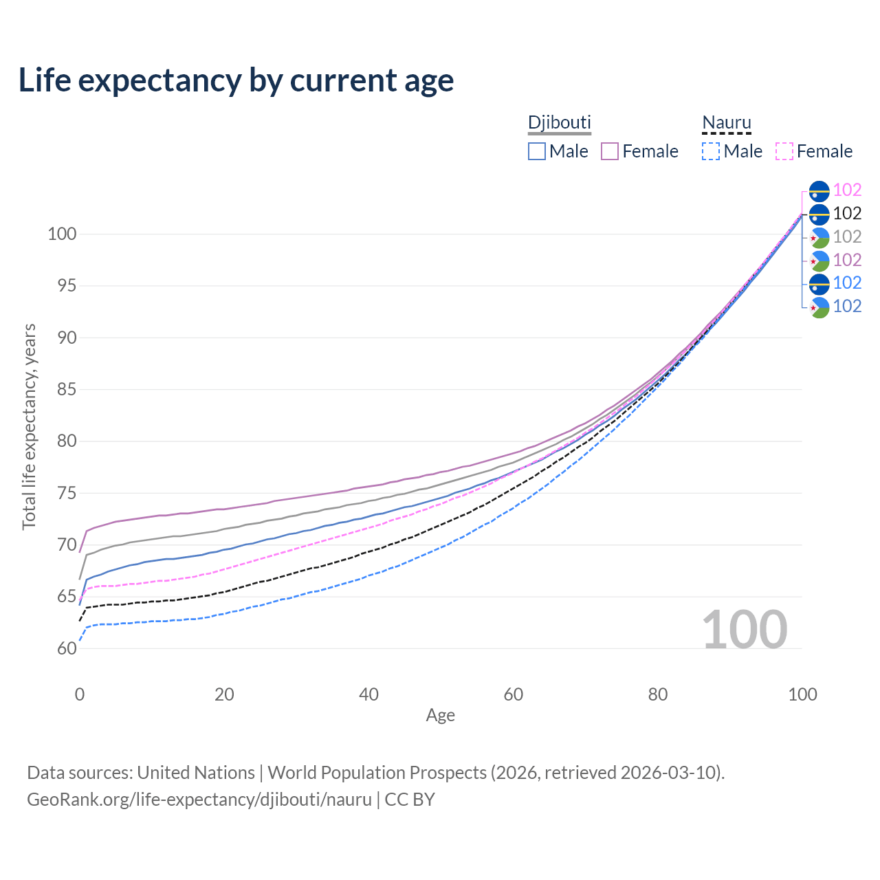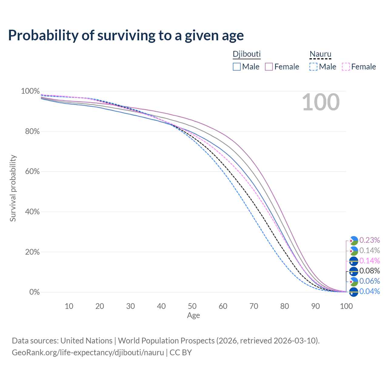 This life expectancy calculator shows the odds of living to 100, 95, 90, and below based on current age for both males and females in Djibouti and Nauru, along with mean and median age of death. The calculations are based on the 2026 life tables (actuarial tables) from the UN World Population Prospects.