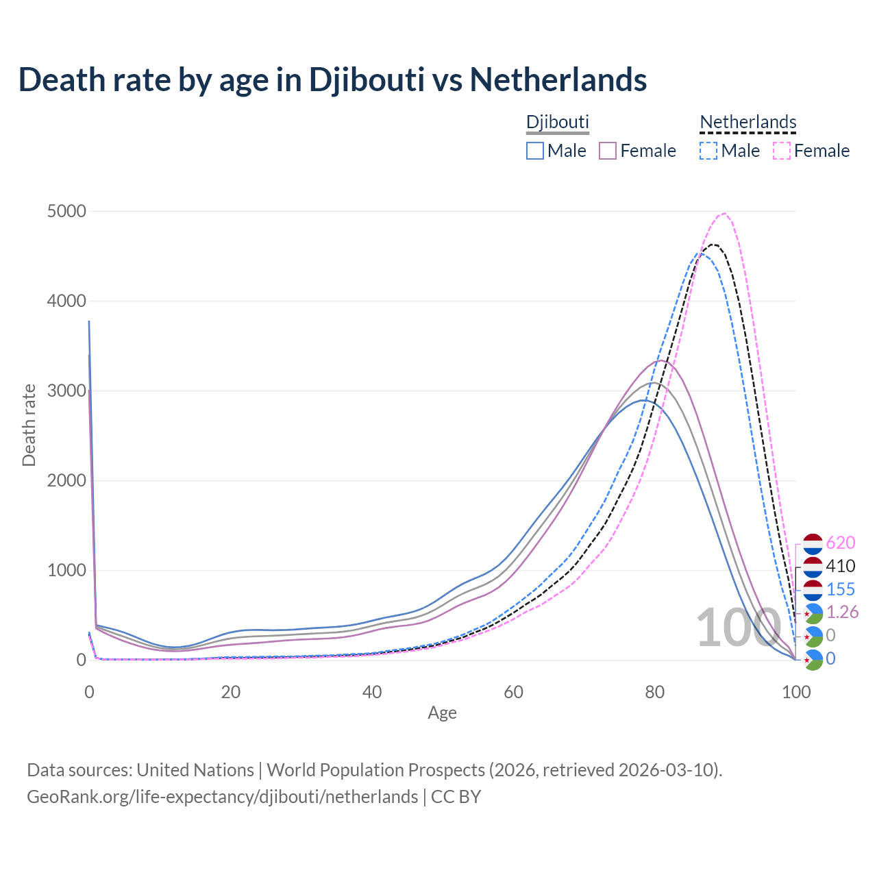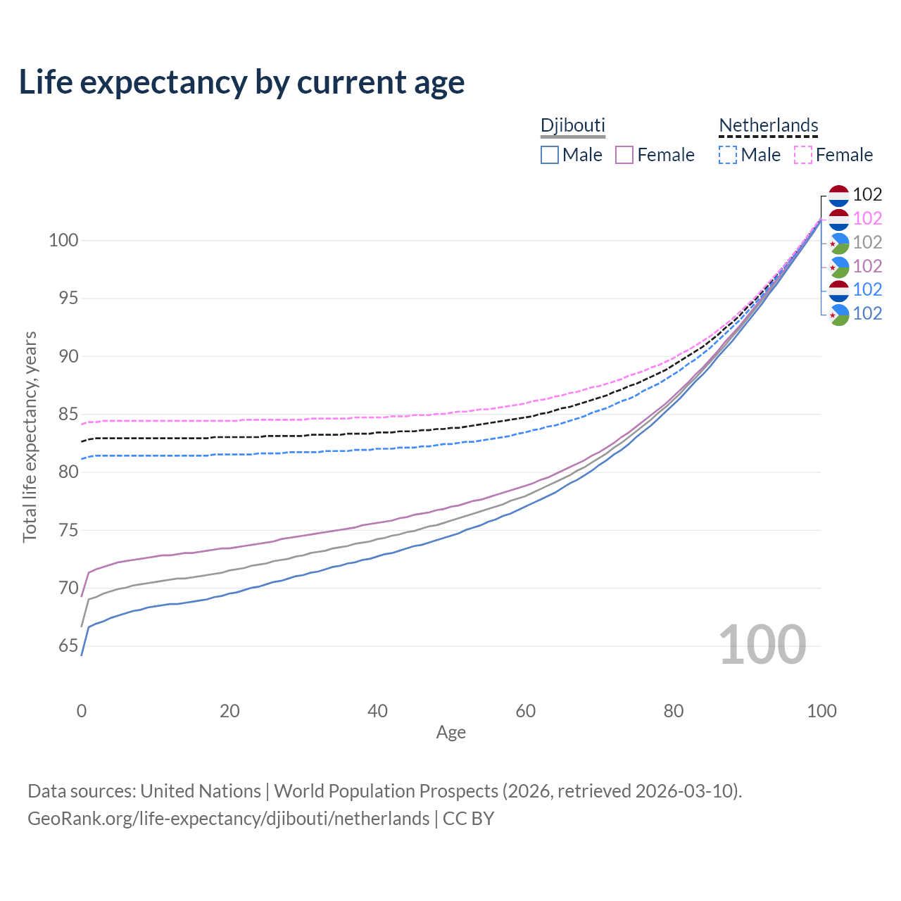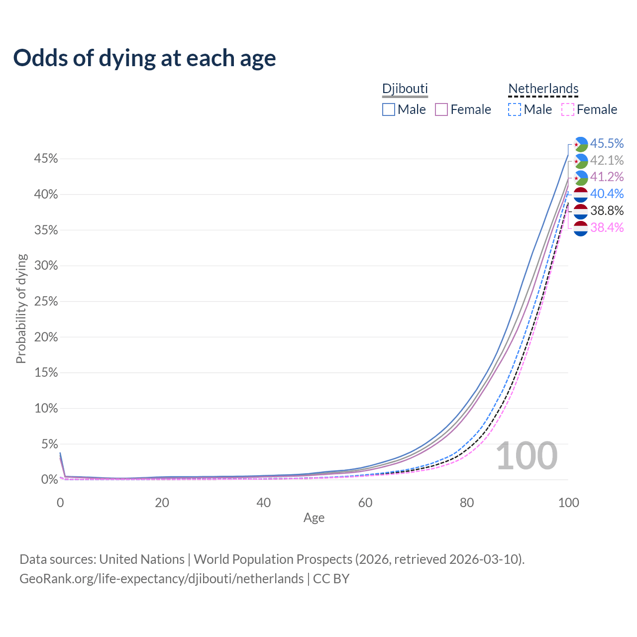 This life expectancy calculator shows the odds of living to 100, 95, 90, and below based on current age for both males and females in Djibouti and the Netherlands, along with mean and median age of death. The calculations are based on the 2026 life tables (actuarial tables) from the UN World Population Prospects.