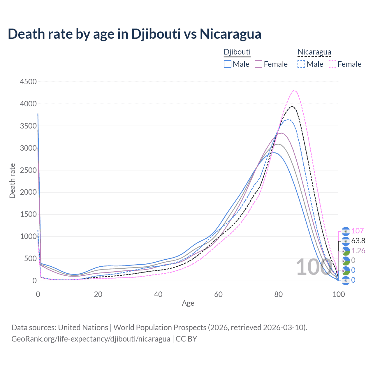 In Djibouti, the most common age of death is 0, compared to 85 in Nicaragua. The median age of death is 73.7 in Djibouti and 79.9 in Nicaragua, meaning only half of each cohort is expected to live past that age.