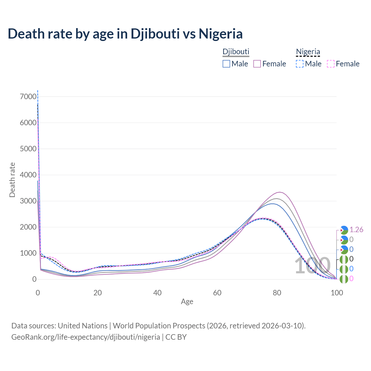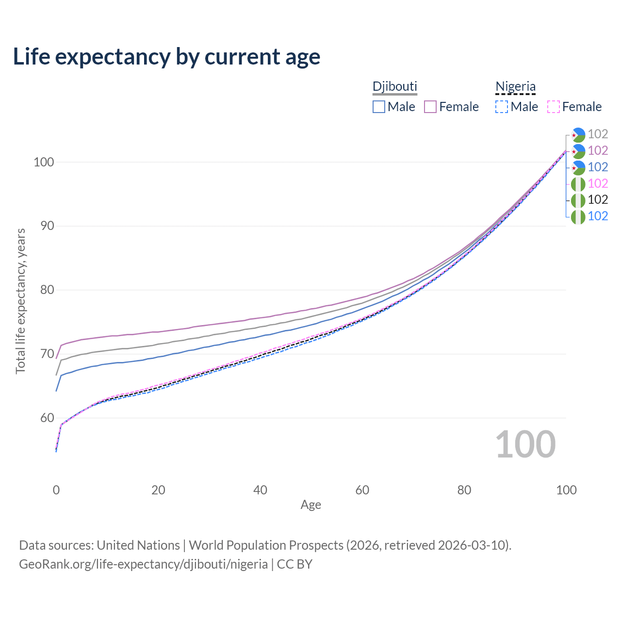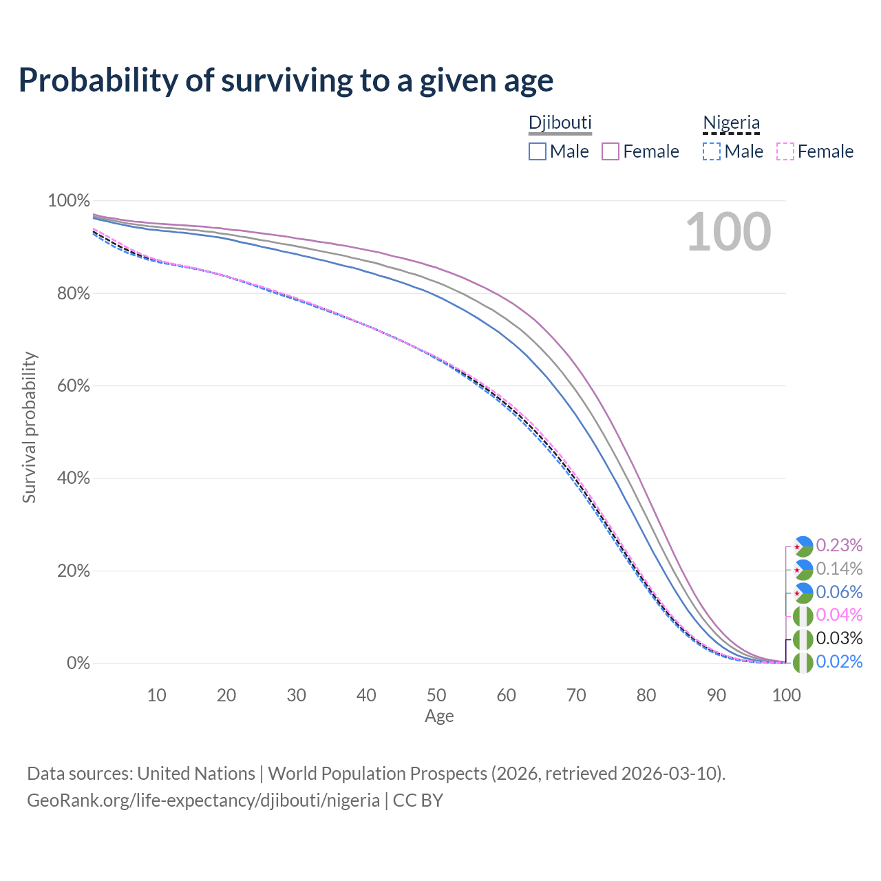 This life expectancy calculator shows the odds of living to 100, 95, 90, and below based on current age for both males and females in Djibouti and Nigeria, along with mean and median age of death. The calculations are based on the 2026 life tables (actuarial tables) from the UN World Population Prospects.