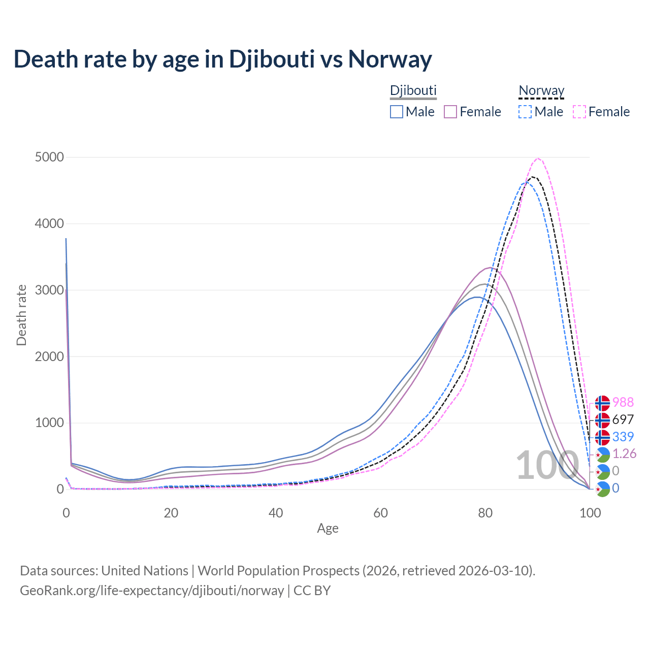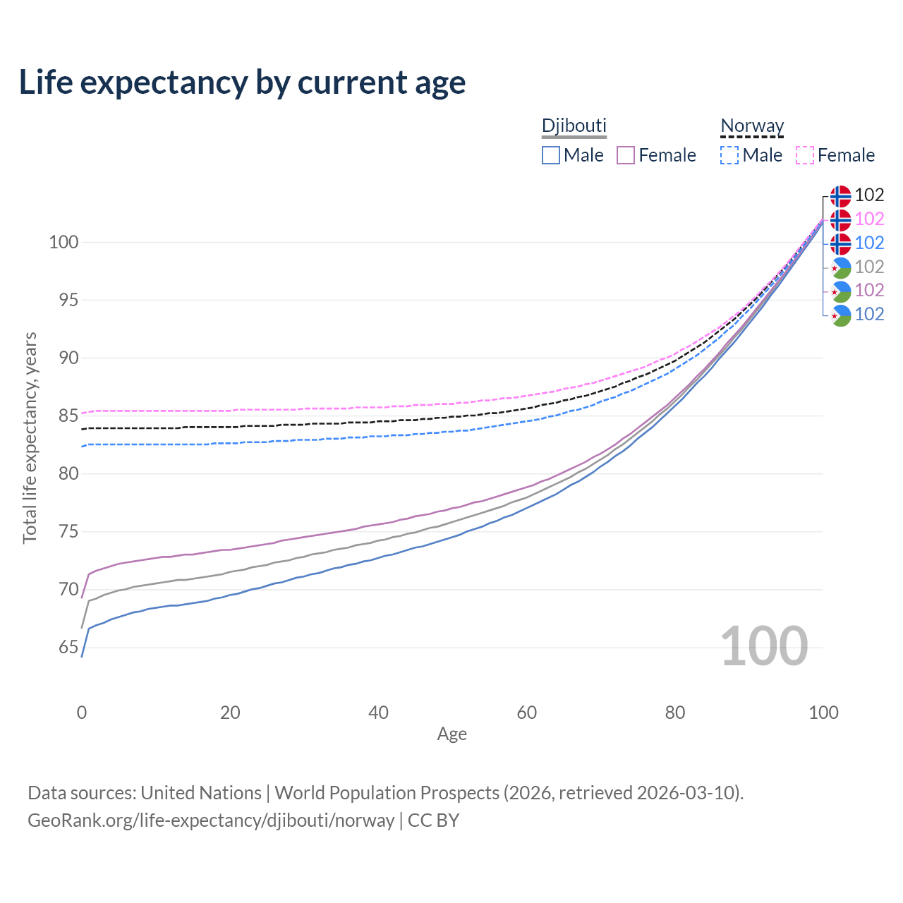 This life expectancy calculator shows the odds of living to 100, 95, 90, and below based on current age for both males and females in Djibouti and Norway, along with mean and median age of death. The calculations are based on the 2026 life tables (actuarial tables) from the UN World Population Prospects.