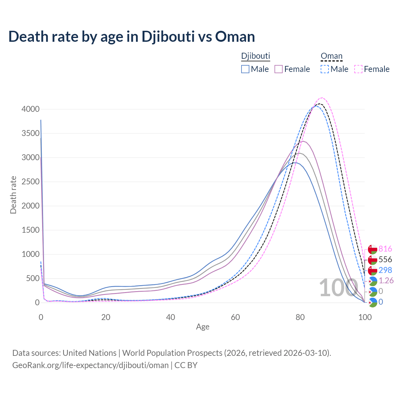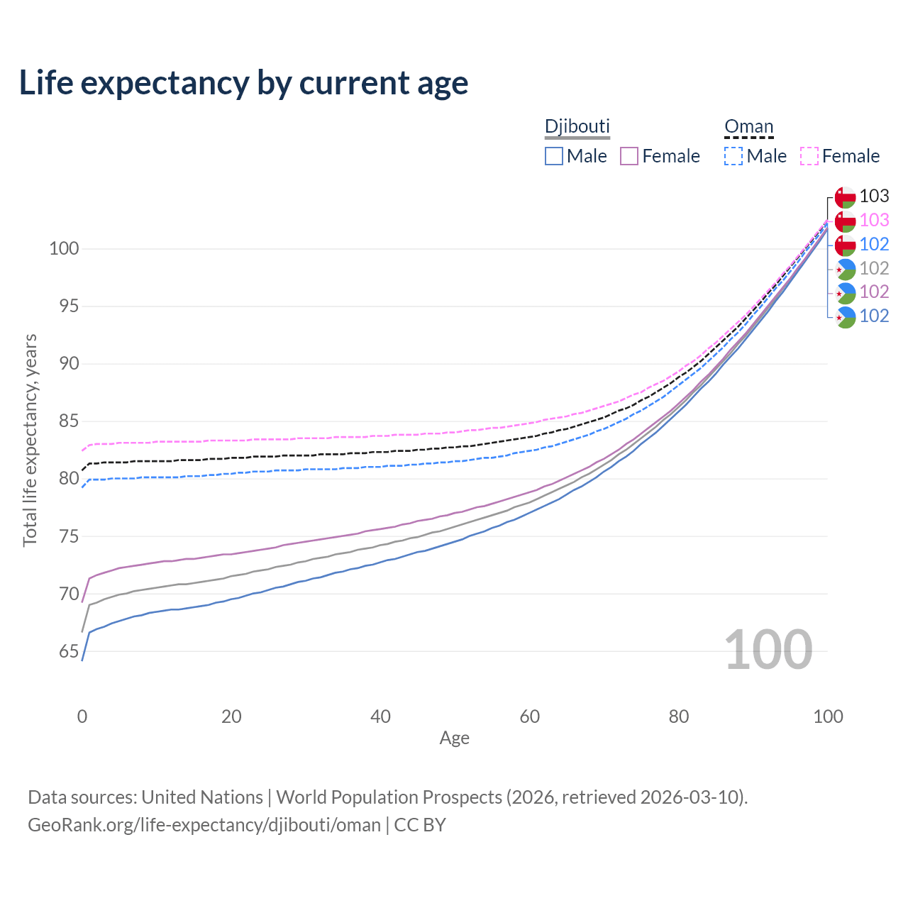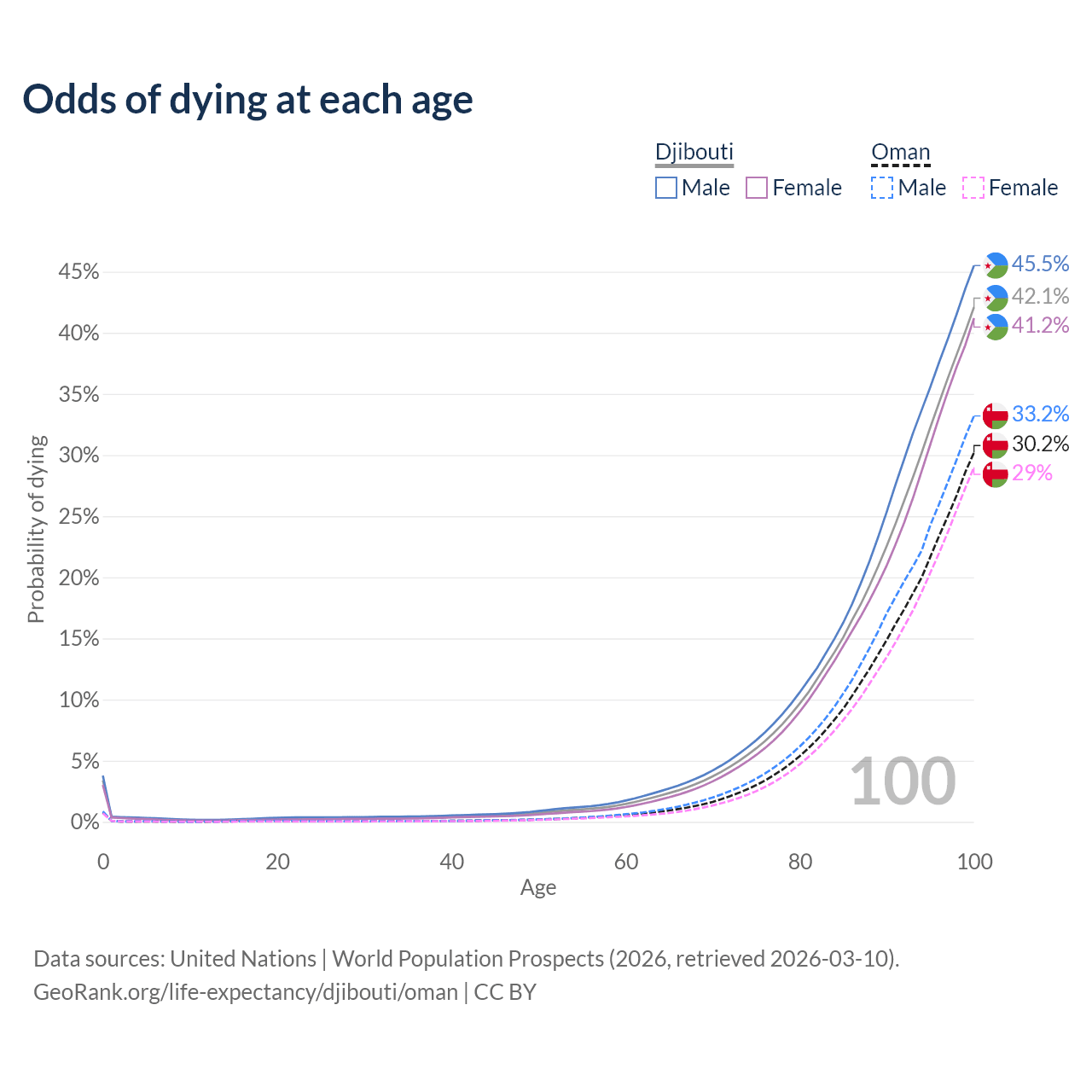 This life expectancy calculator shows the odds of living to 100, 95, 90, and below based on current age for both males and females in Djibouti and Oman, along with mean and median age of death. The calculations are based on the 2026 life tables (actuarial tables) from the UN World Population Prospects.