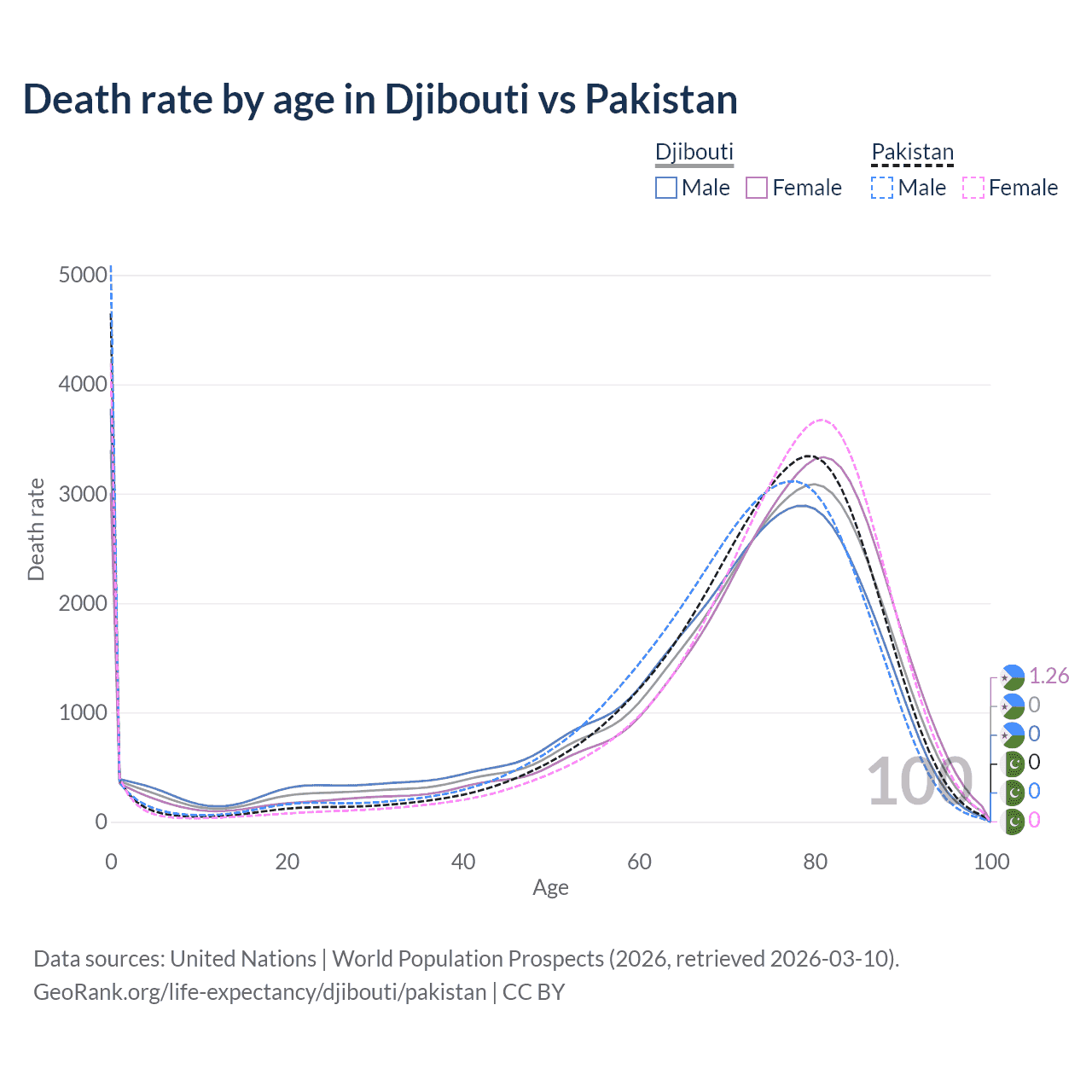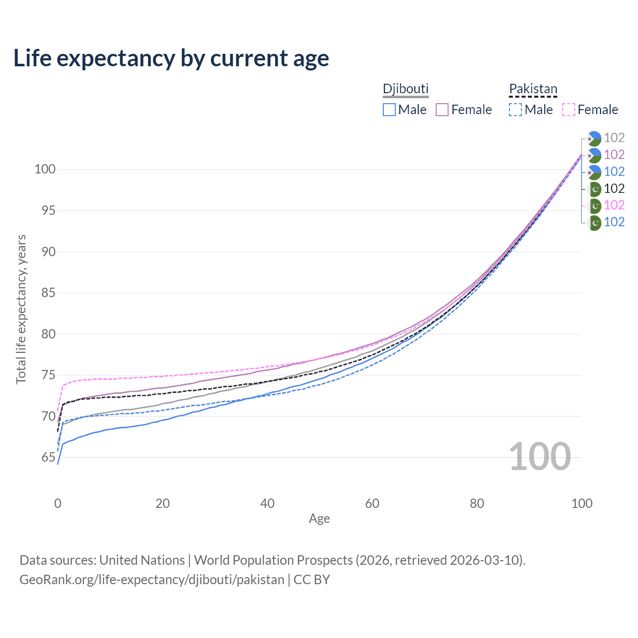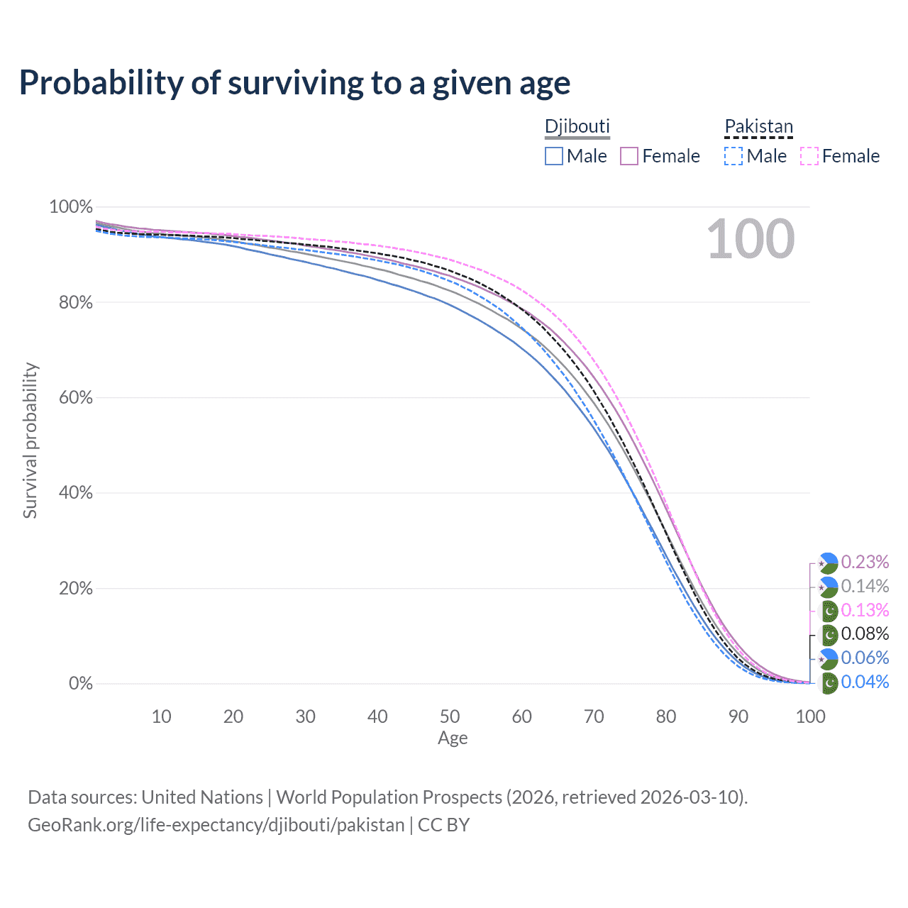 This life expectancy calculator shows the odds of living to 100, 95, 90, and below based on current age for both males and females in Djibouti and Pakistan, along with mean and median age of death. The calculations are based on the 2026 life tables (actuarial tables) from the UN World Population Prospects.