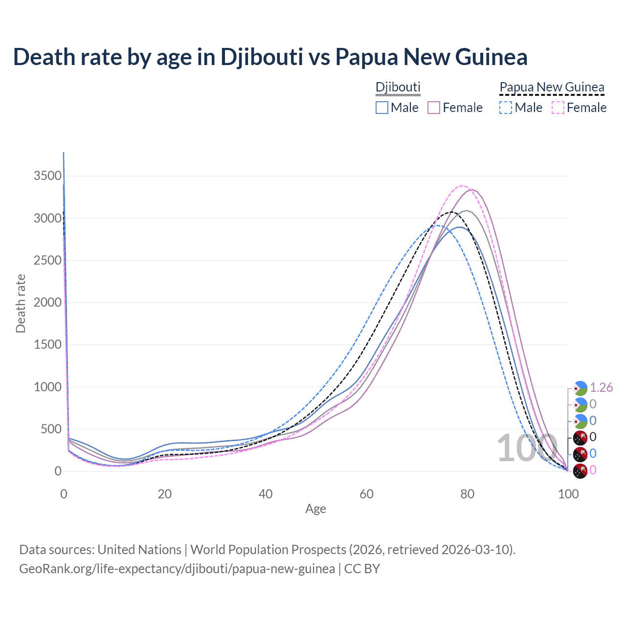 In Djibouti, the most common age of death is 0, compared to 0 in Papua New Guinea. The median age of death is 73.7 in Djibouti and 71.7 in Papua New Guinea, meaning only half of each cohort is expected to live past that age.