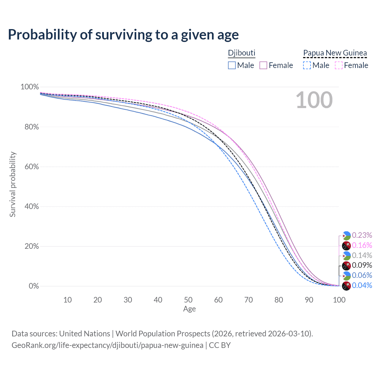 This life expectancy calculator shows the odds of living to 100, 95, 90, and below based on current age for both males and females in Djibouti and Papua New Guinea, along with mean and median age of death. The calculations are based on the 2026 life tables (actuarial tables) from the UN World Population Prospects.