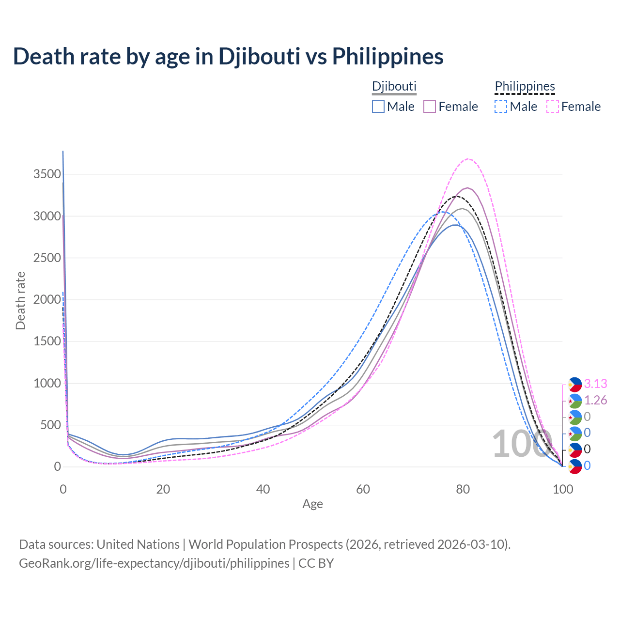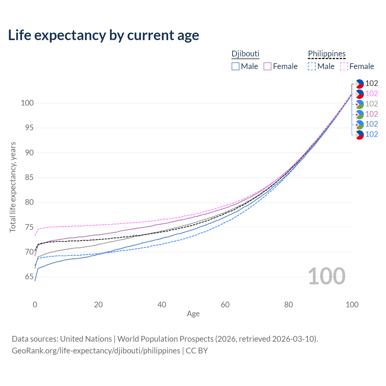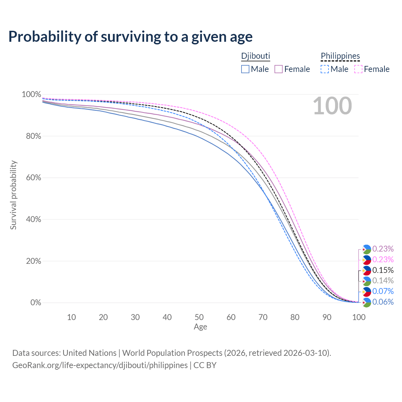 This life expectancy calculator shows the odds of living to 100, 95, 90, and below based on current age for both males and females in Djibouti and the Philippines, along with mean and median age of death. The calculations are based on the 2026 life tables (actuarial tables) from the UN World Population Prospects.