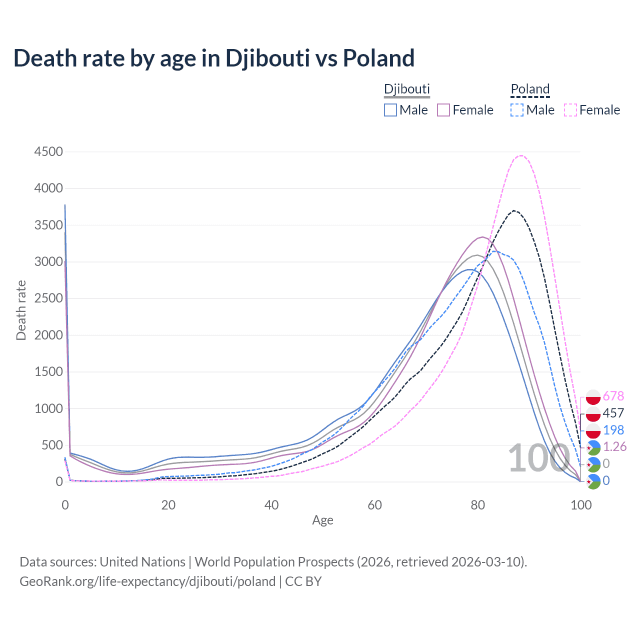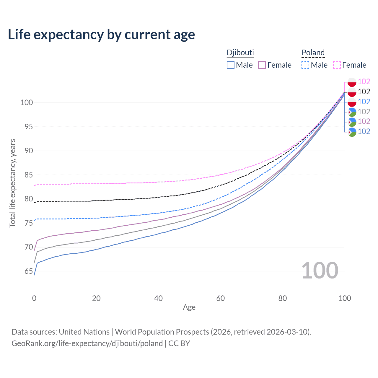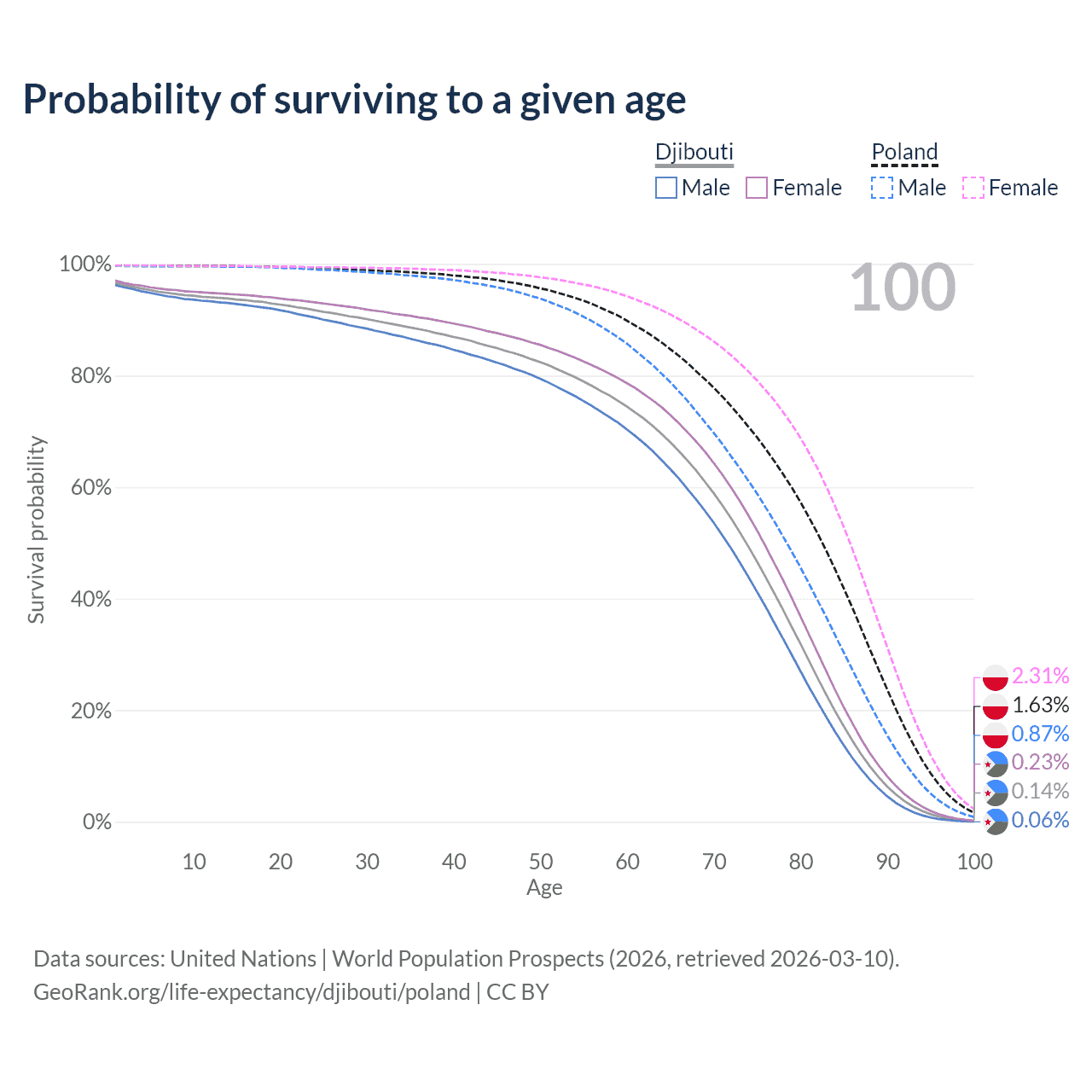 This life expectancy calculator shows the odds of living to 100, 95, 90, and below based on current age for both males and females in Djibouti and Poland, along with mean and median age of death. The calculations are based on the 2026 life tables (actuarial tables) from the UN World Population Prospects.