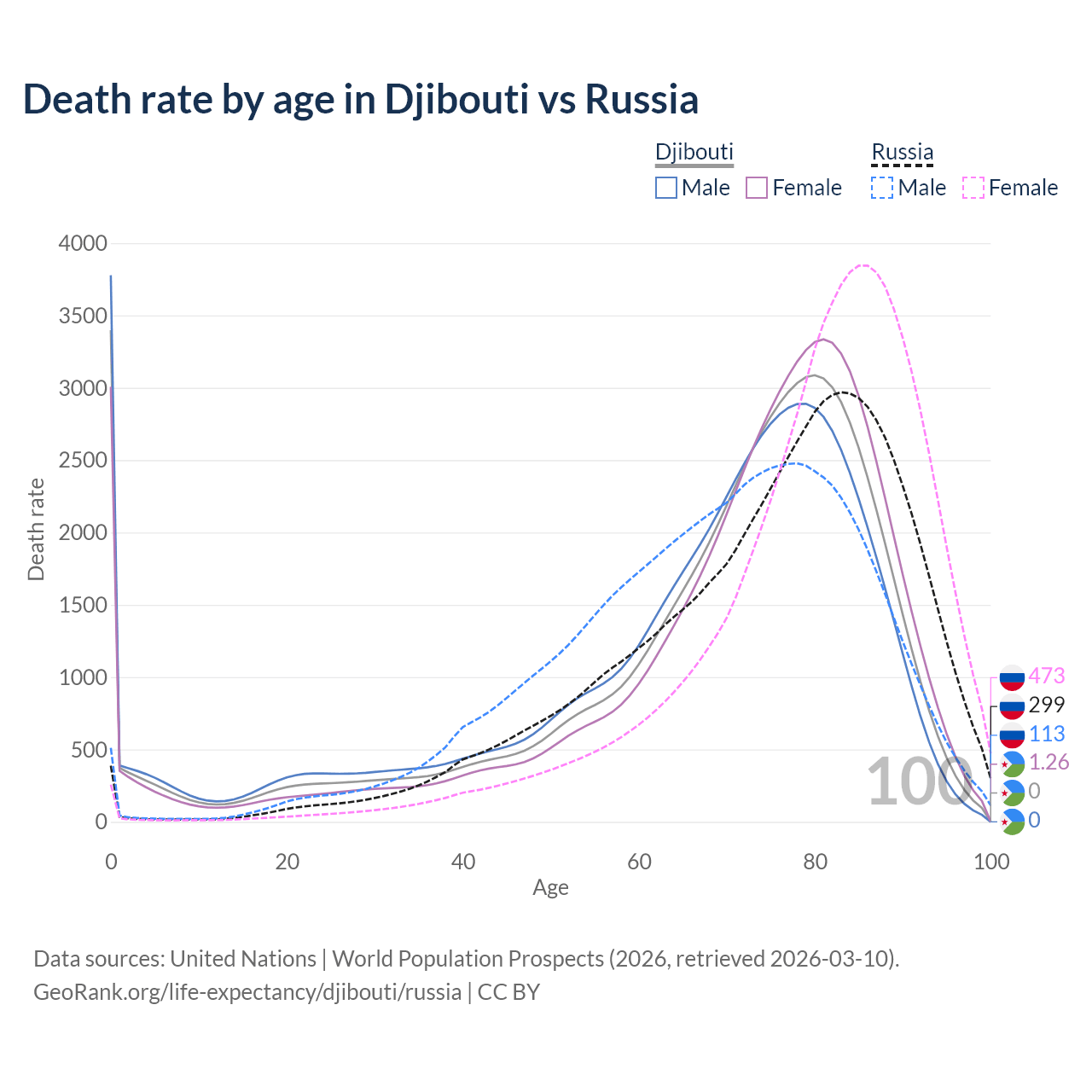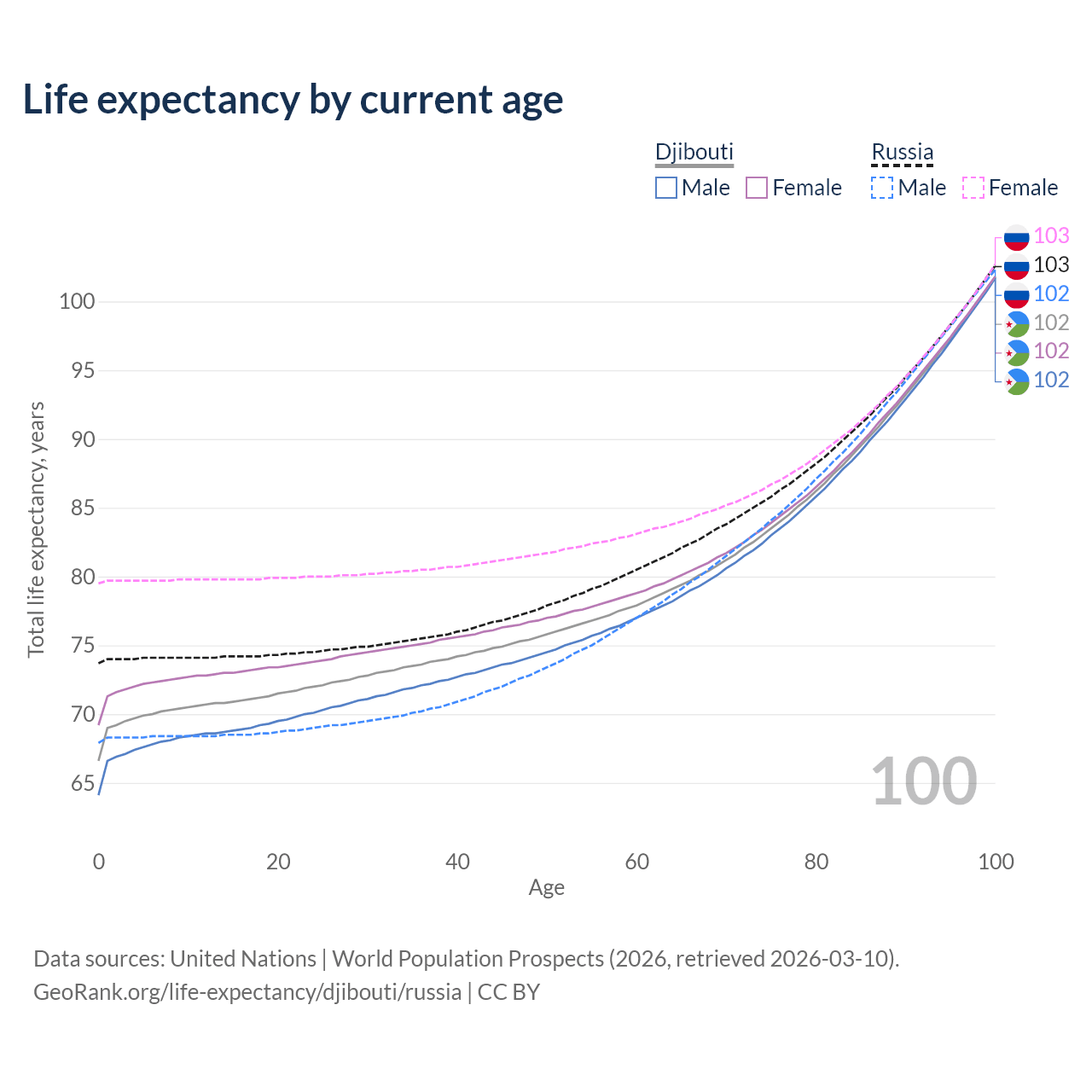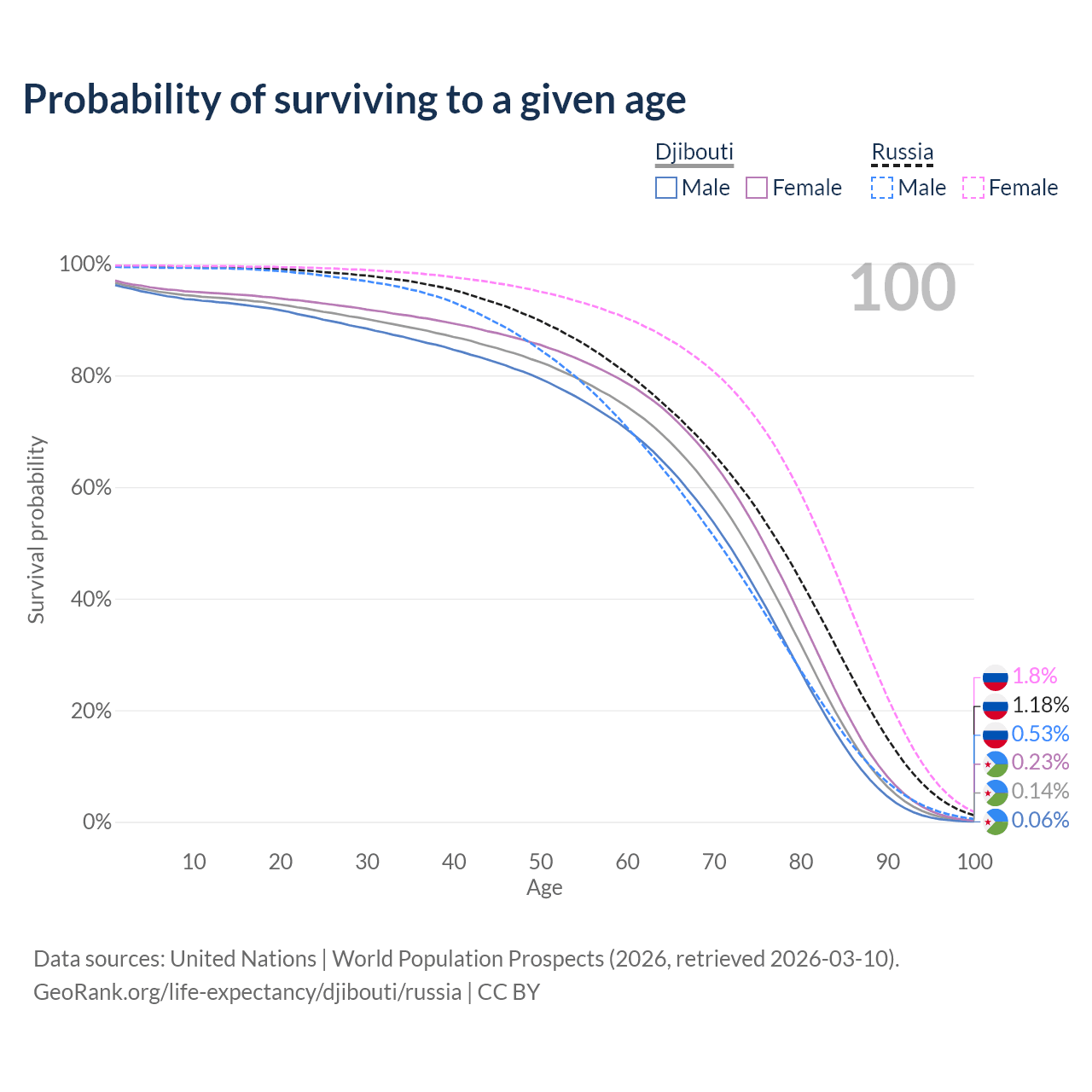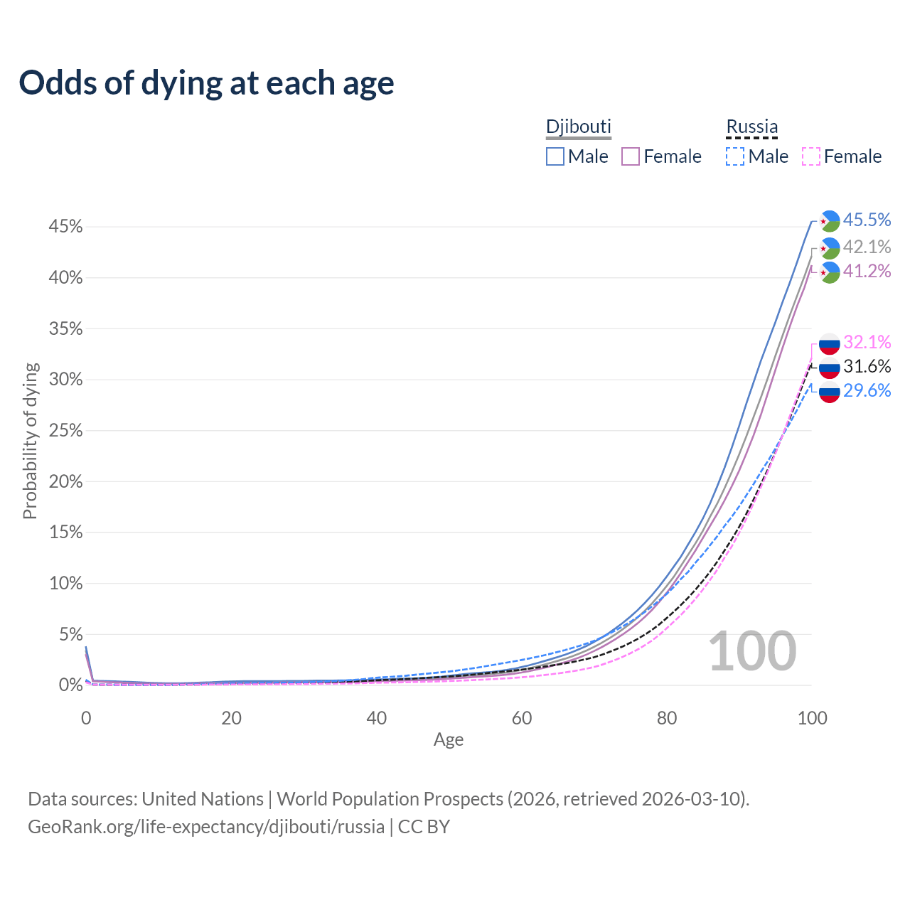 This life expectancy calculator shows the odds of living to 100, 95, 90, and below based on current age for both males and females in Djibouti and Russia, along with mean and median age of death. The calculations are based on the 2026 life tables (actuarial tables) from the UN World Population Prospects.
