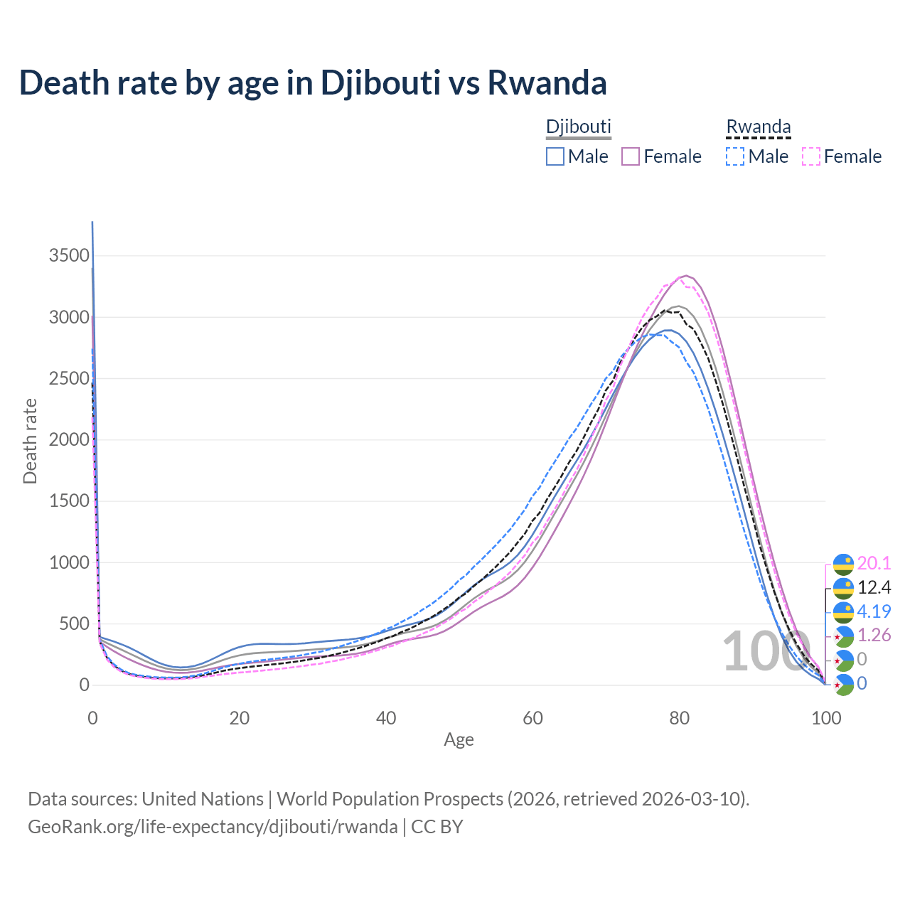 In Djibouti, the most common age of death is 0, compared to 78 in Rwanda. The median age of death is 73.7 in Djibouti and 73.5 in Rwanda, meaning only half of each cohort is expected to live past that age.