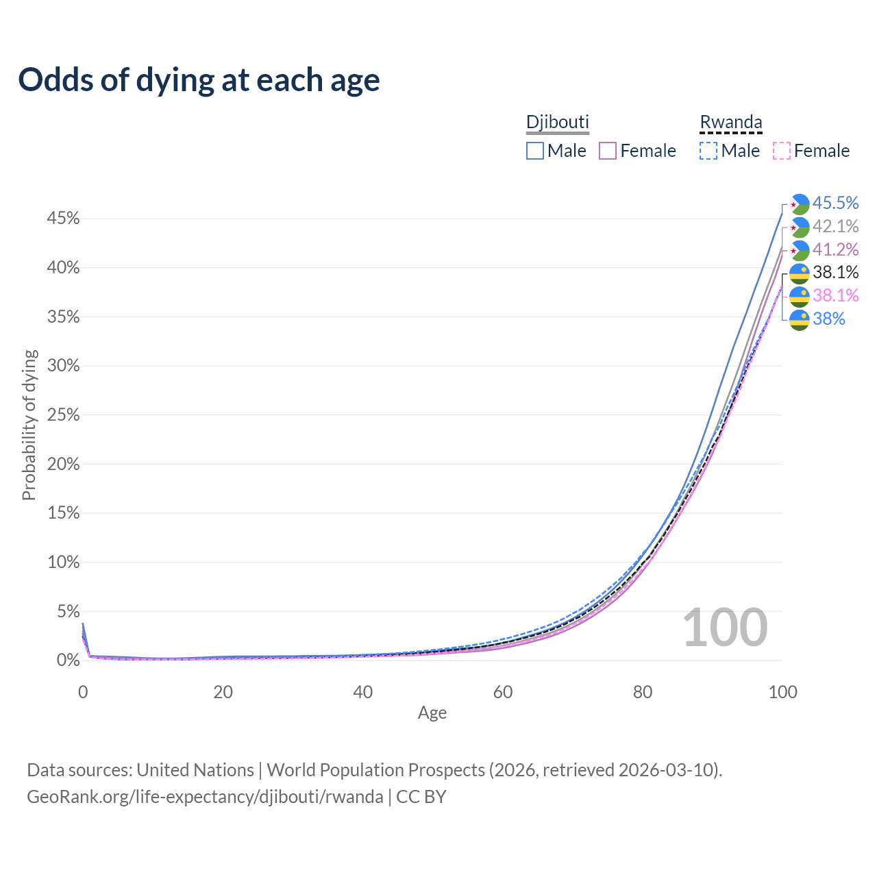 This life expectancy calculator shows the odds of living to 100, 95, 90, and below based on current age for both males and females in Djibouti and Rwanda, along with mean and median age of death. The calculations are based on the 2026 life tables (actuarial tables) from the UN World Population Prospects.