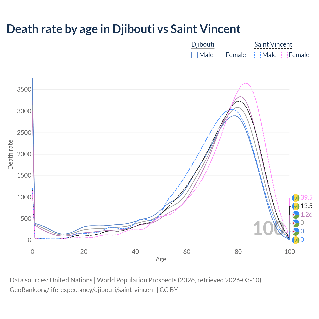 In Djibouti, the most common age of death is 0, compared to 80 in Saint Vincent. The median age of death is 73.7 in Djibouti and 75.6 in Saint Vincent, meaning only half of each cohort is expected to live past that age.