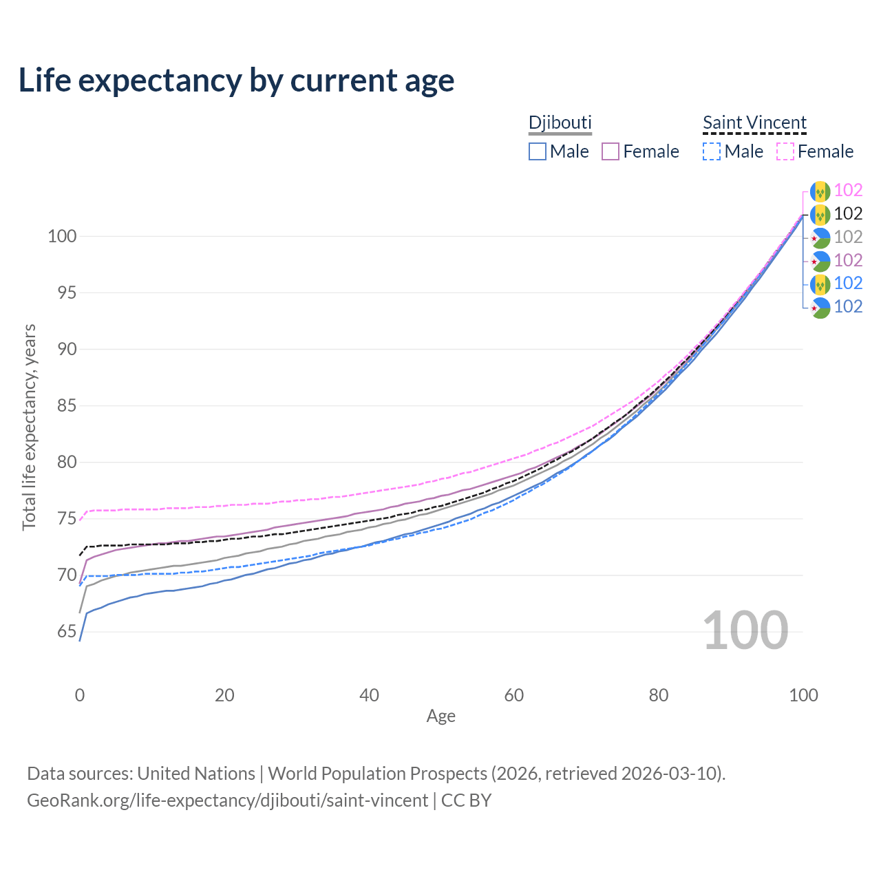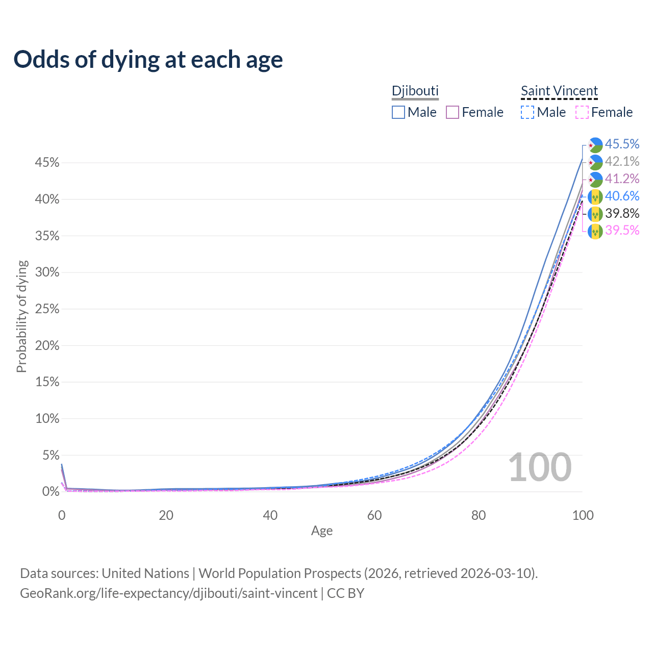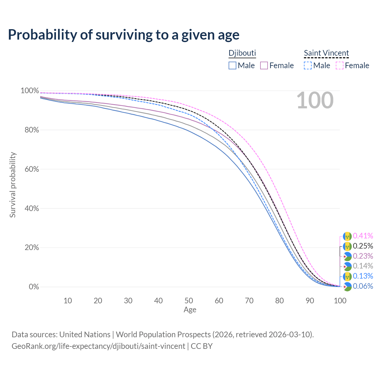 This life expectancy calculator shows the odds of living to 100, 95, 90, and below based on current age for both males and females in Djibouti and Saint Vincent, along with mean and median age of death. The calculations are based on the 2026 life tables (actuarial tables) from the UN World Population Prospects.