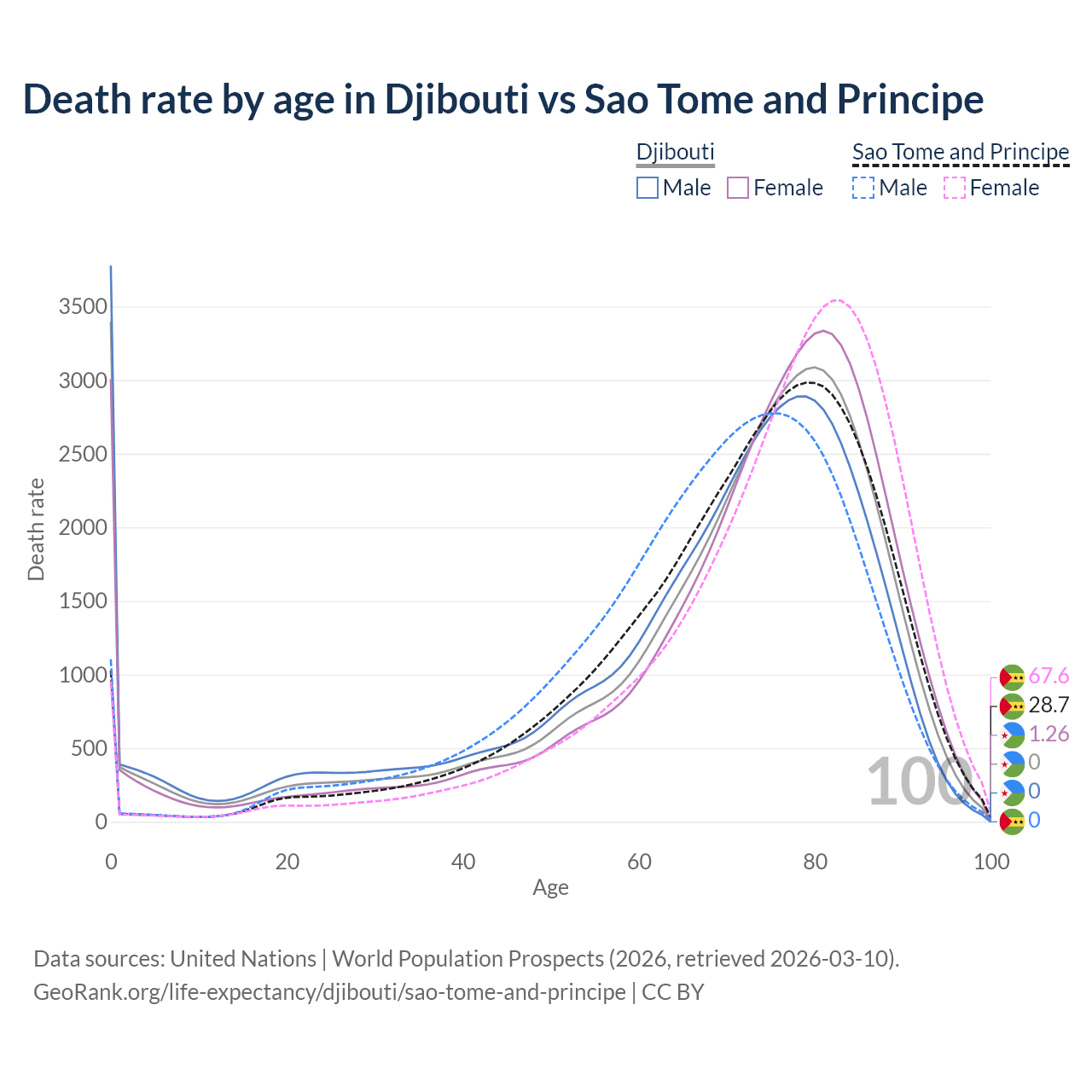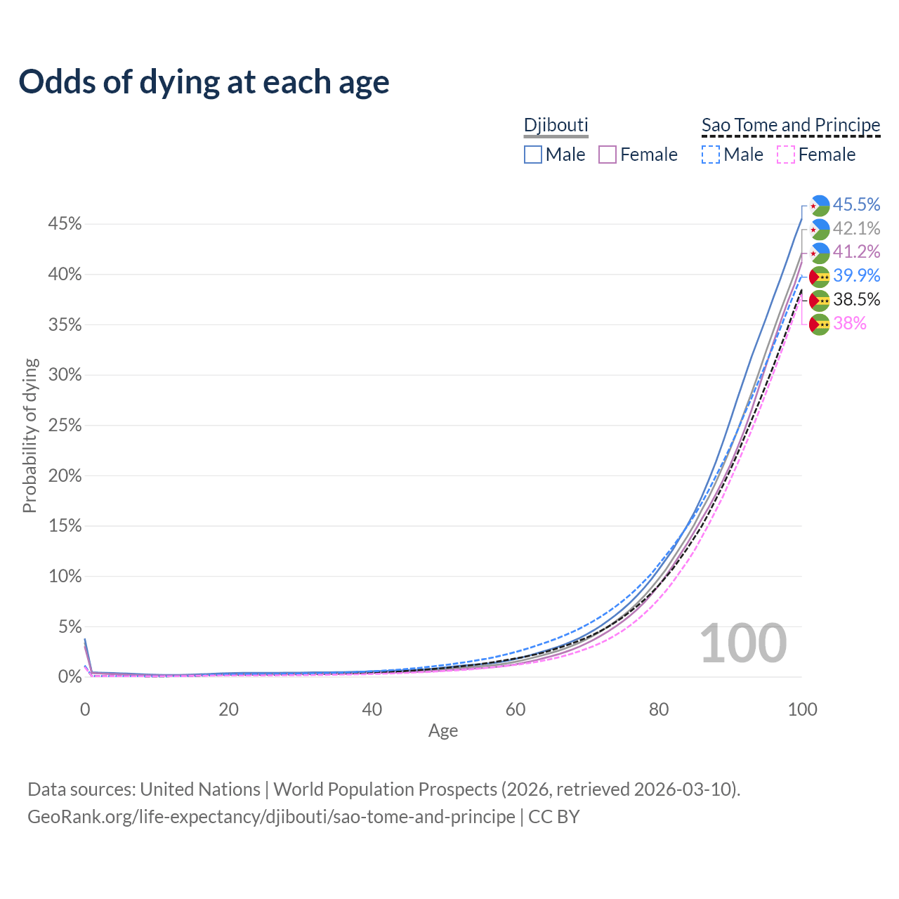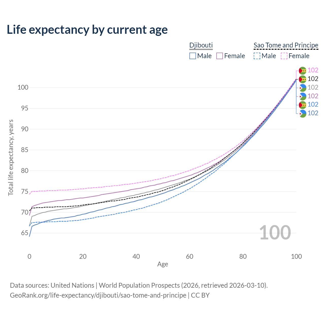 This life expectancy calculator shows the odds of living to 100, 95, 90, and below based on current age for both males and females in Djibouti and Sao Tome and Principe, along with mean and median age of death. The calculations are based on the 2026 life tables (actuarial tables) from the UN World Population Prospects.