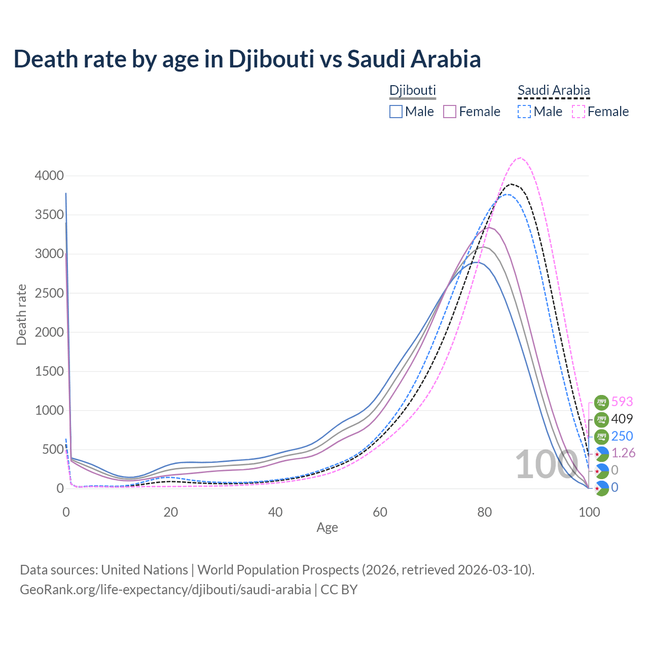 In Djibouti, the most common age of death is 0, compared to 85 in Saudi Arabia. The median age of death is 73.7 in Djibouti and 82.5 in Saudi Arabia, meaning only half of each cohort is expected to live past that age.