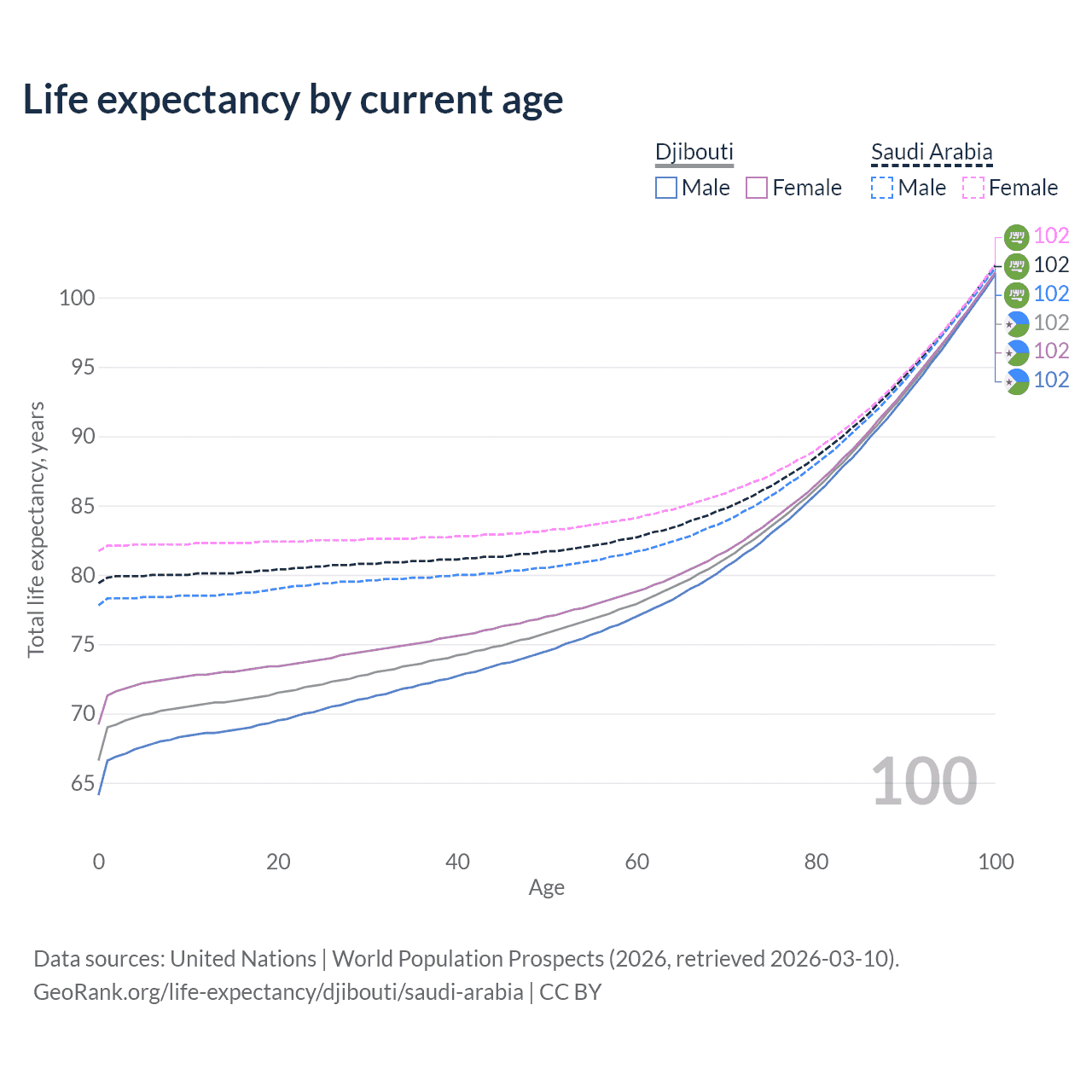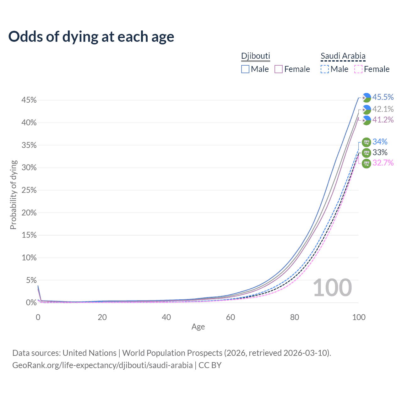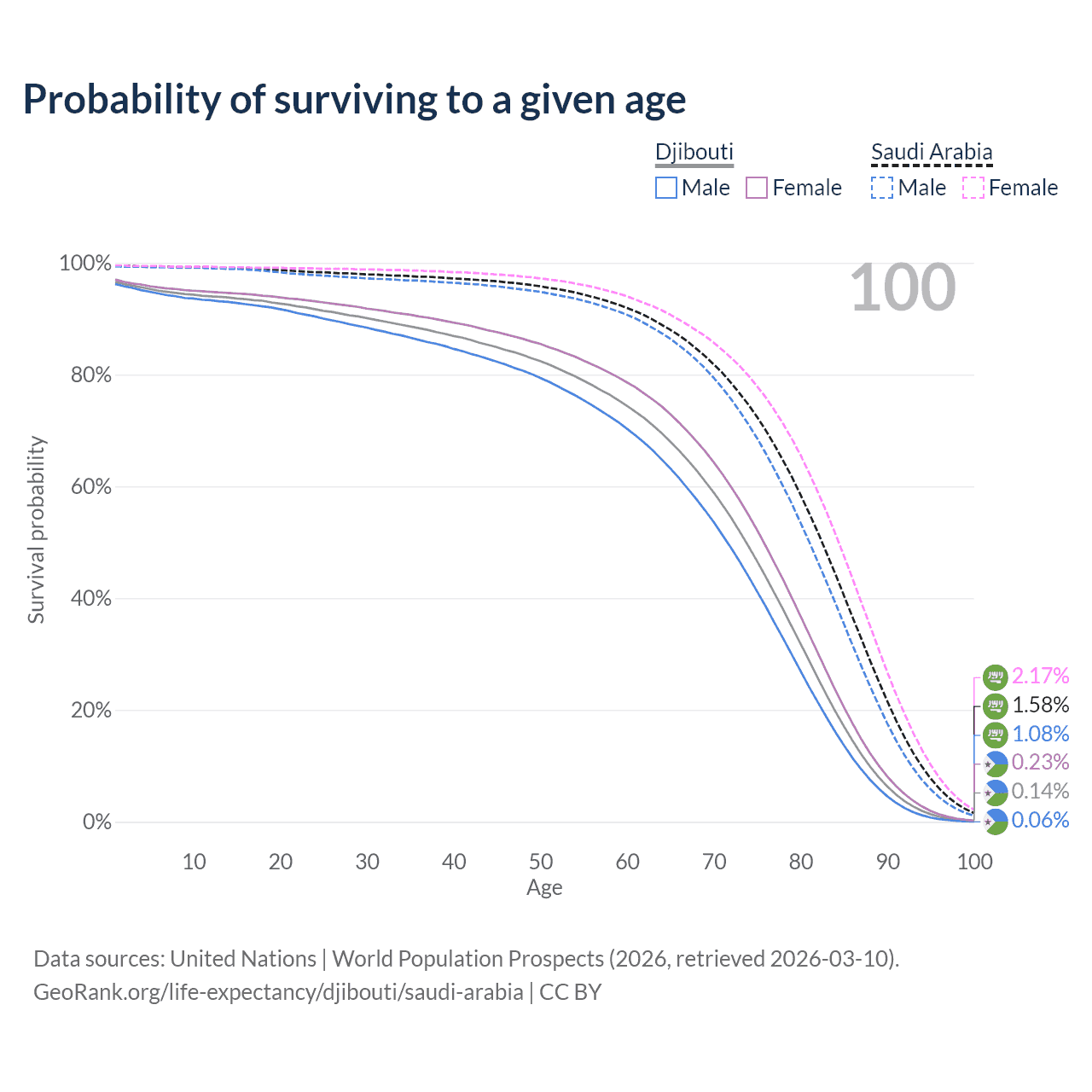 This life expectancy calculator shows the odds of living to 100, 95, 90, and below based on current age for both males and females in Djibouti and Saudi Arabia, along with mean and median age of death. The calculations are based on the 2026 life tables (actuarial tables) from the UN World Population Prospects.