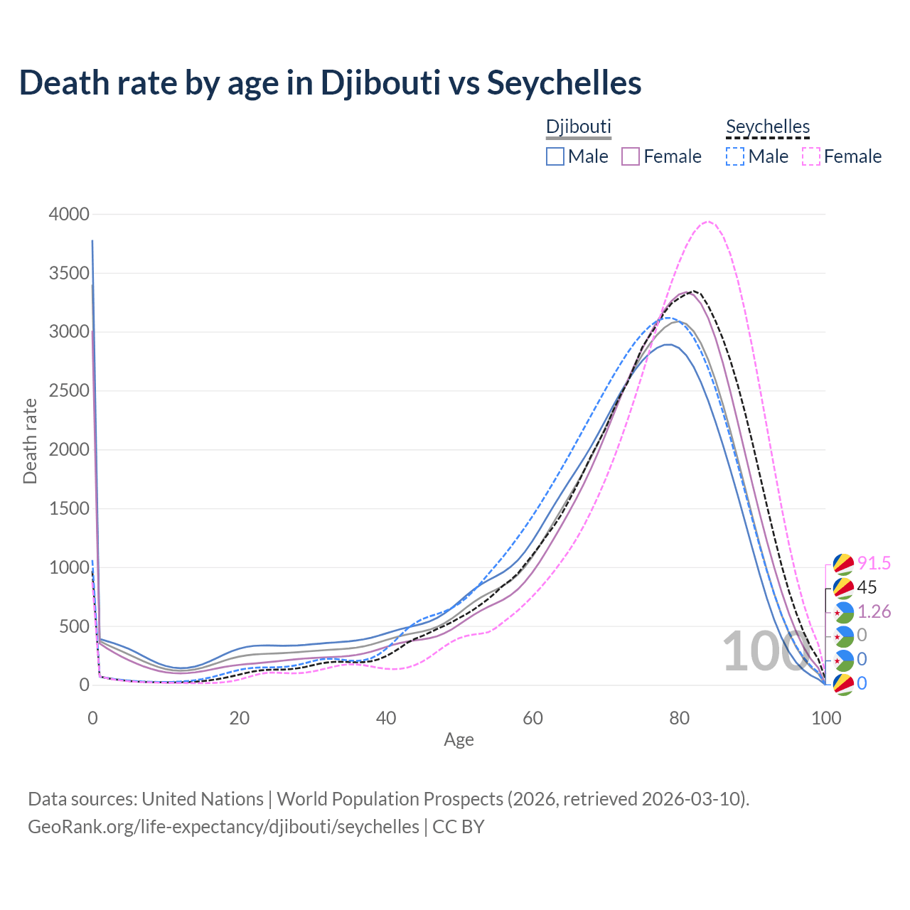 In Djibouti, the most common age of death is 0, compared to 82 in the Seychelles. The median age of death is 73.7 in Djibouti and 77 in the Seychelles, meaning only half of each cohort is expected to live past that age.