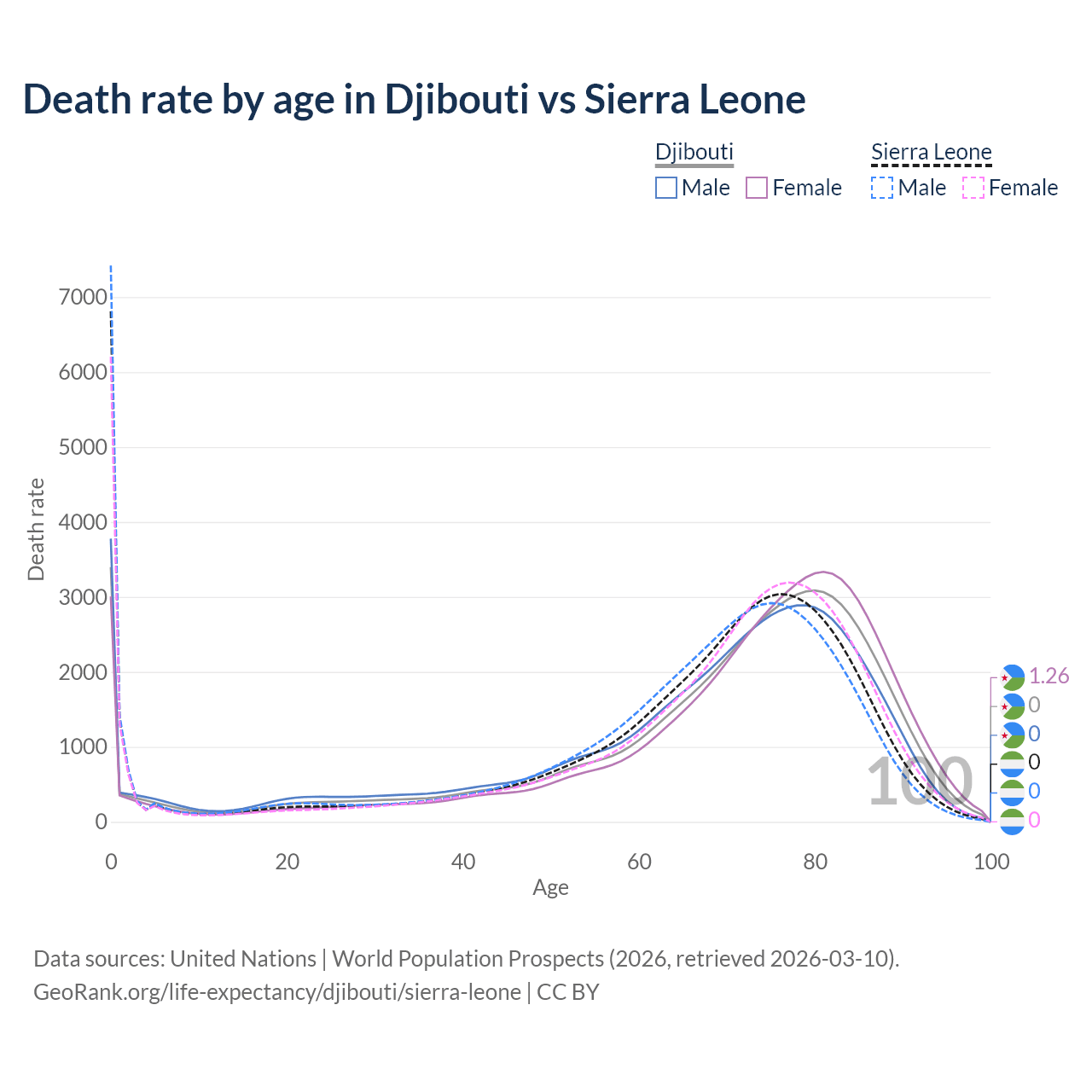 In Djibouti, the most common age of death is 0, compared to 0 in Sierra Leone. The median age of death is 73.7 in Djibouti and 70.8 in Sierra Leone, meaning only half of each cohort is expected to live past that age.