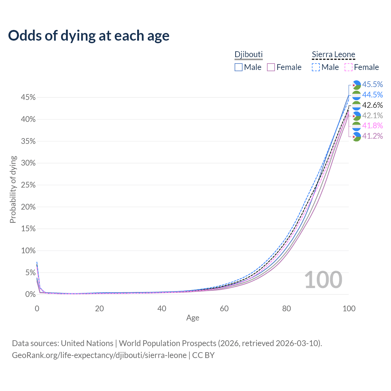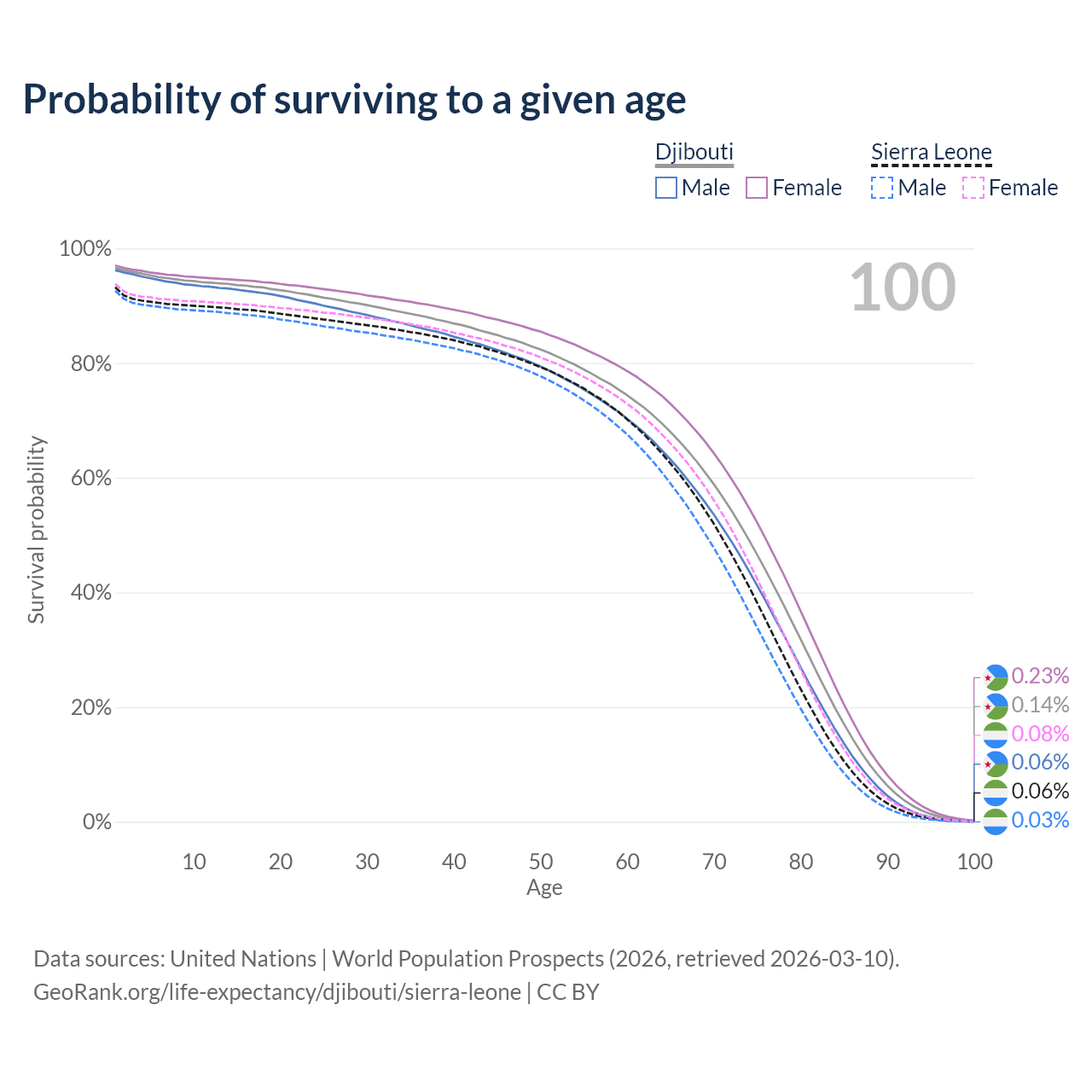 This life expectancy calculator shows the odds of living to 100, 95, 90, and below based on current age for both males and females in Djibouti and Sierra Leone, along with mean and median age of death. The calculations are based on the 2026 life tables (actuarial tables) from the UN World Population Prospects.