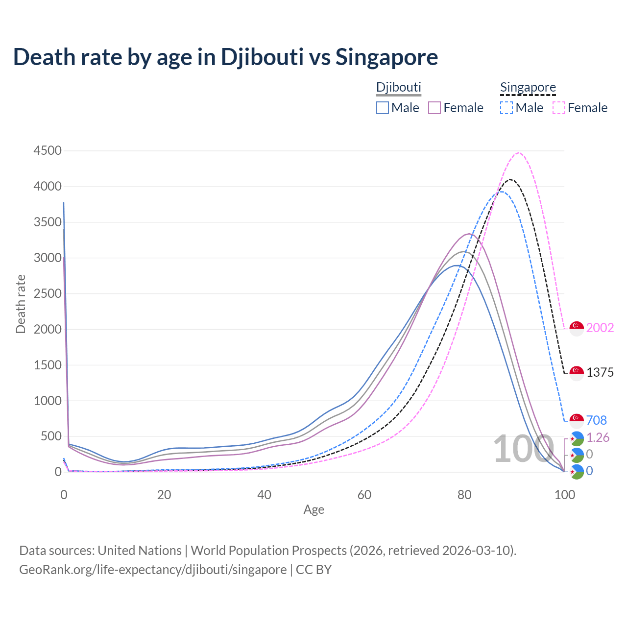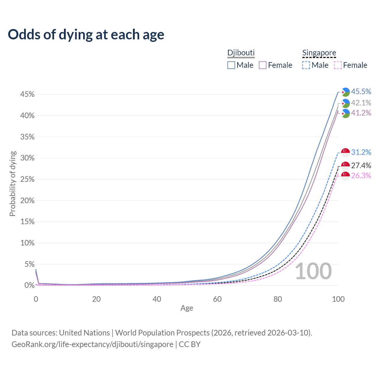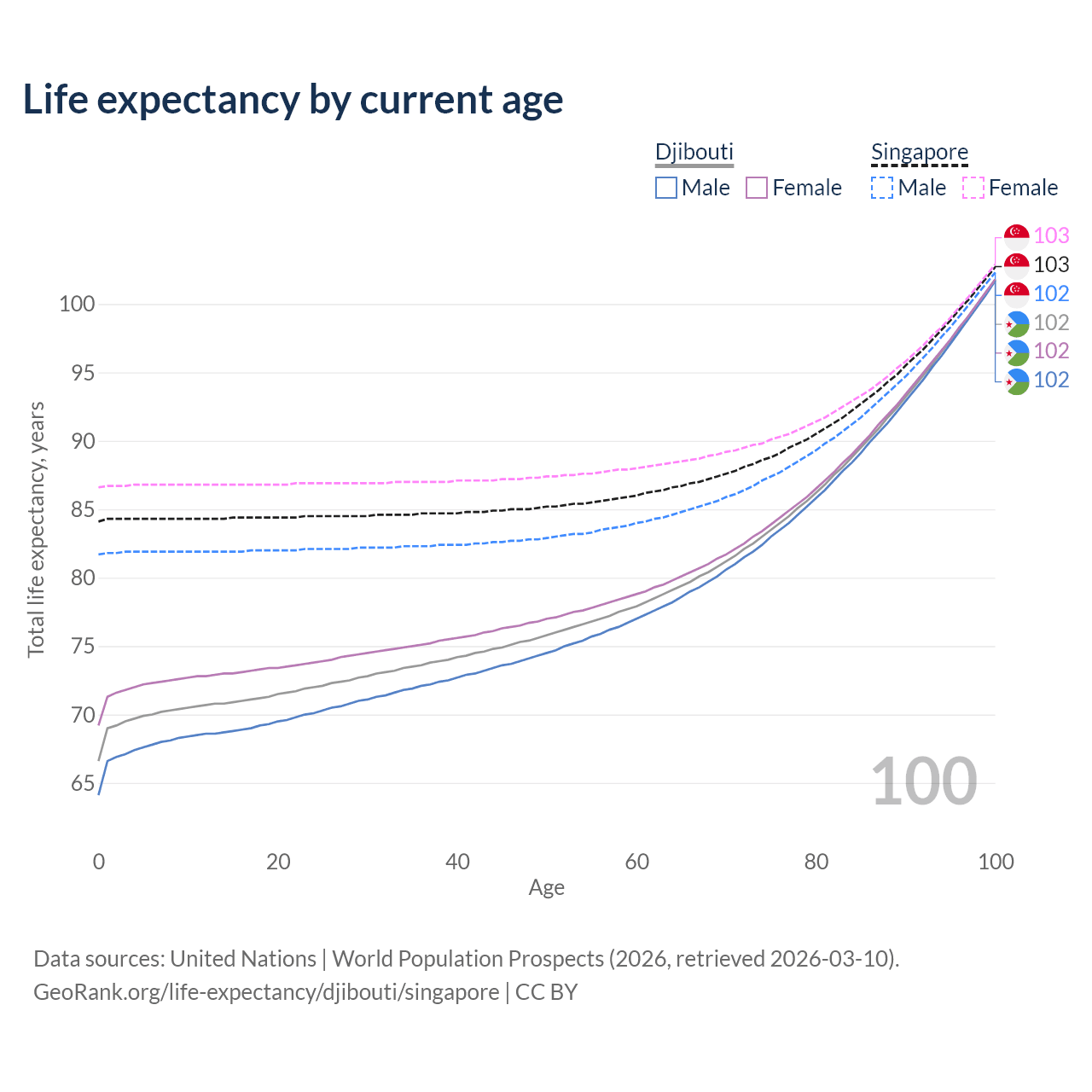 This life expectancy calculator shows the odds of living to 100, 95, 90, and below based on current age for both males and females in Djibouti and Singapore, along with mean and median age of death. The calculations are based on the 2026 life tables (actuarial tables) from the UN World Population Prospects.