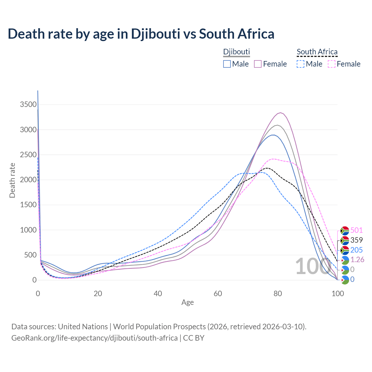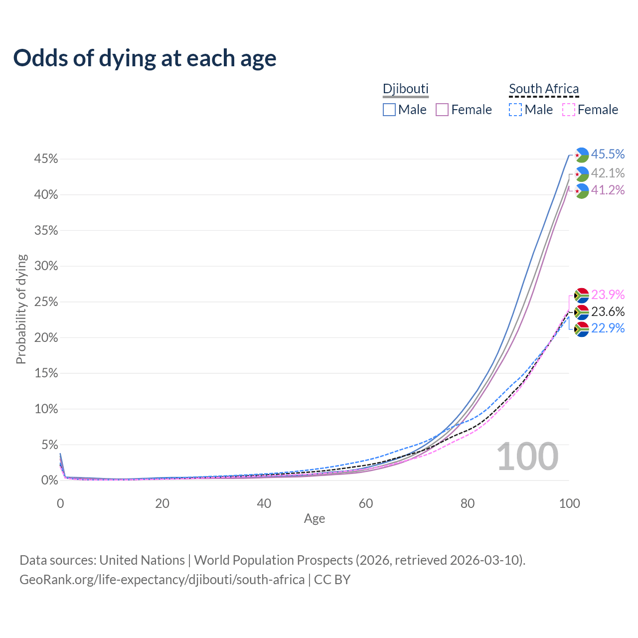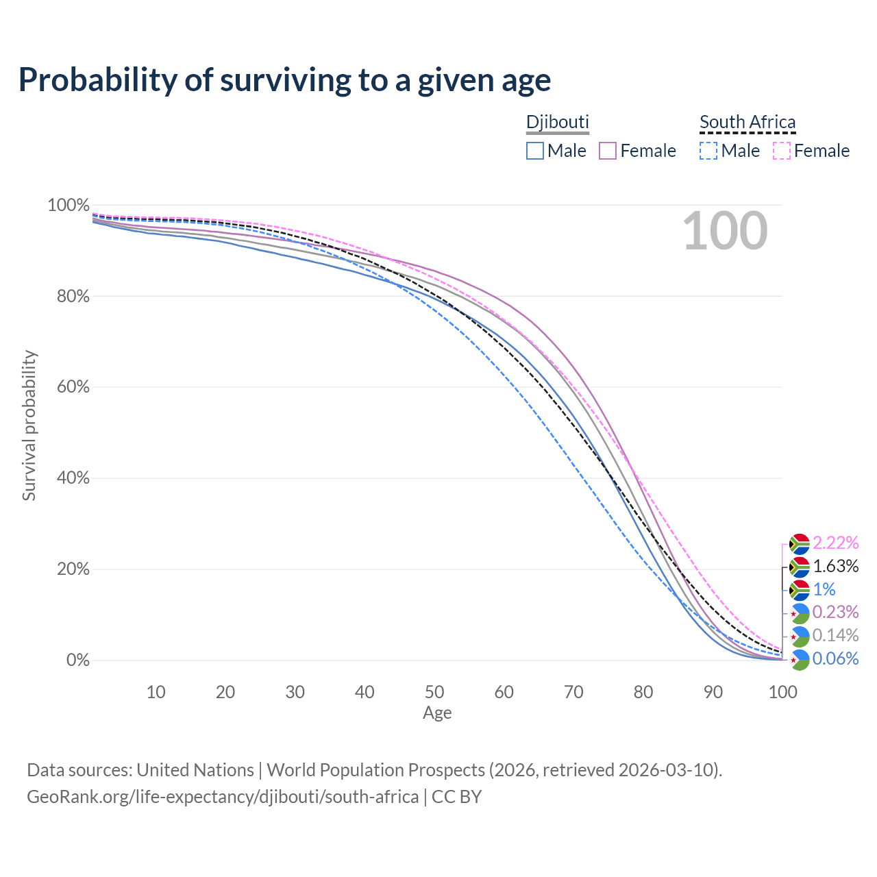 This life expectancy calculator shows the odds of living to 100, 95, 90, and below based on current age for both males and females in Djibouti and South Africa, along with mean and median age of death. The calculations are based on the 2026 life tables (actuarial tables) from the UN World Population Prospects.