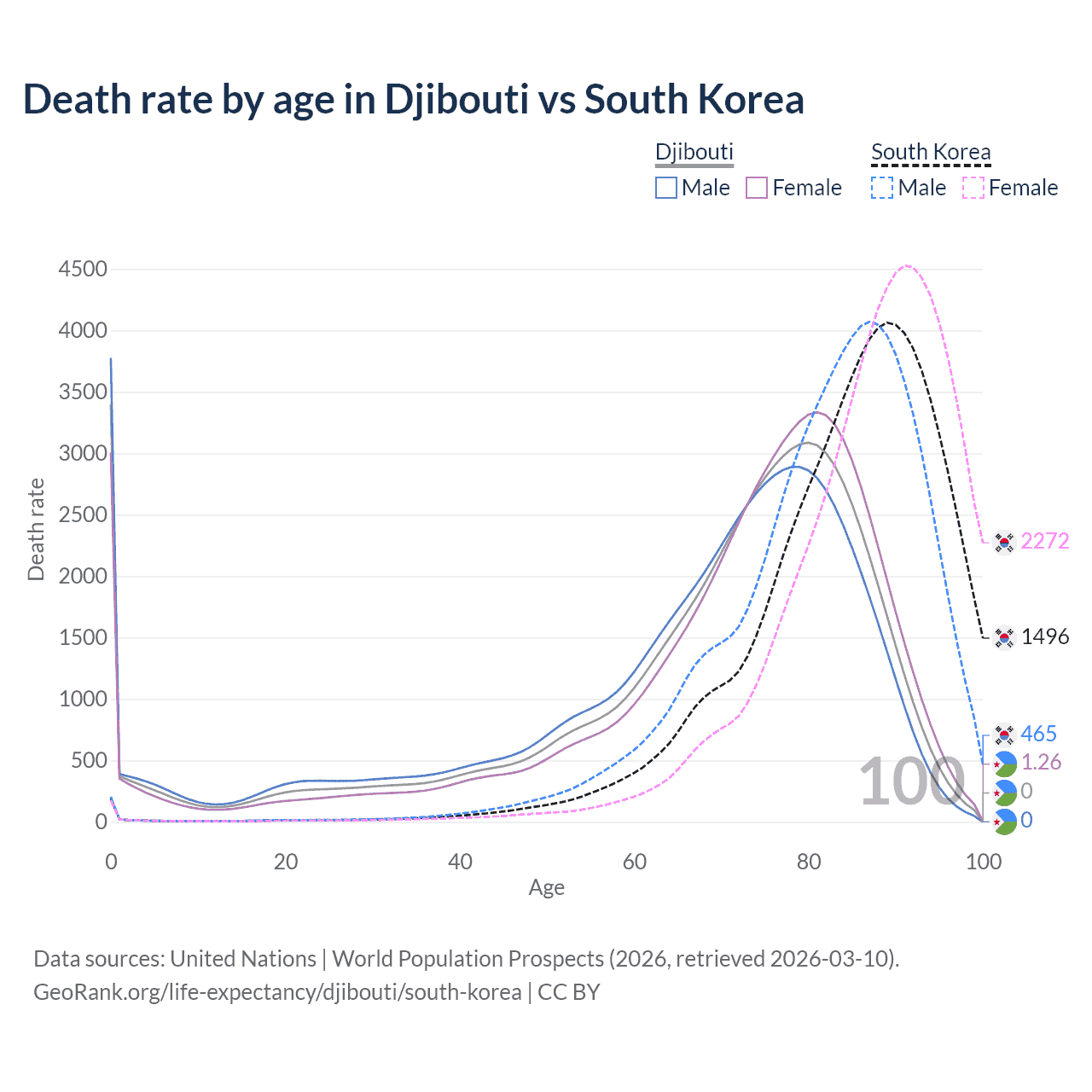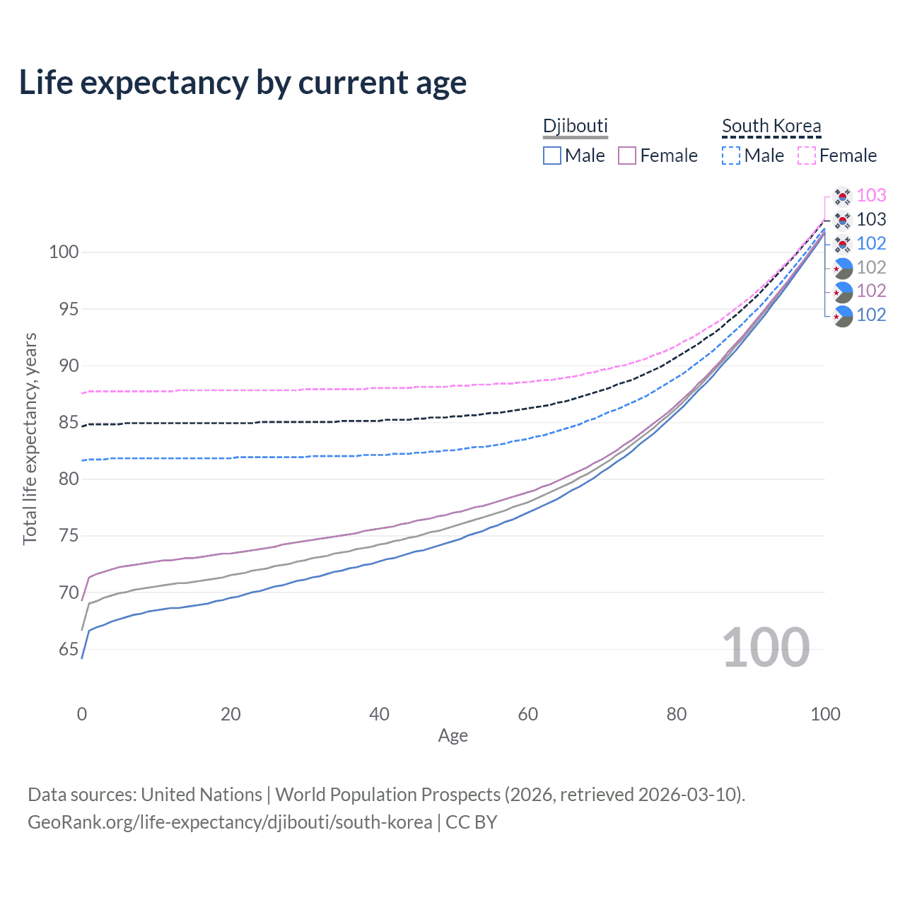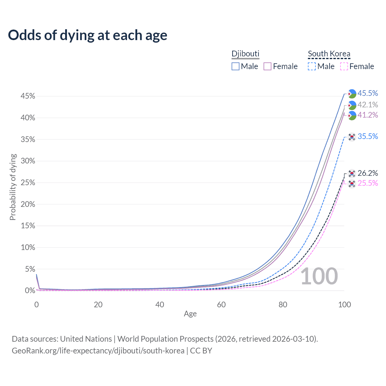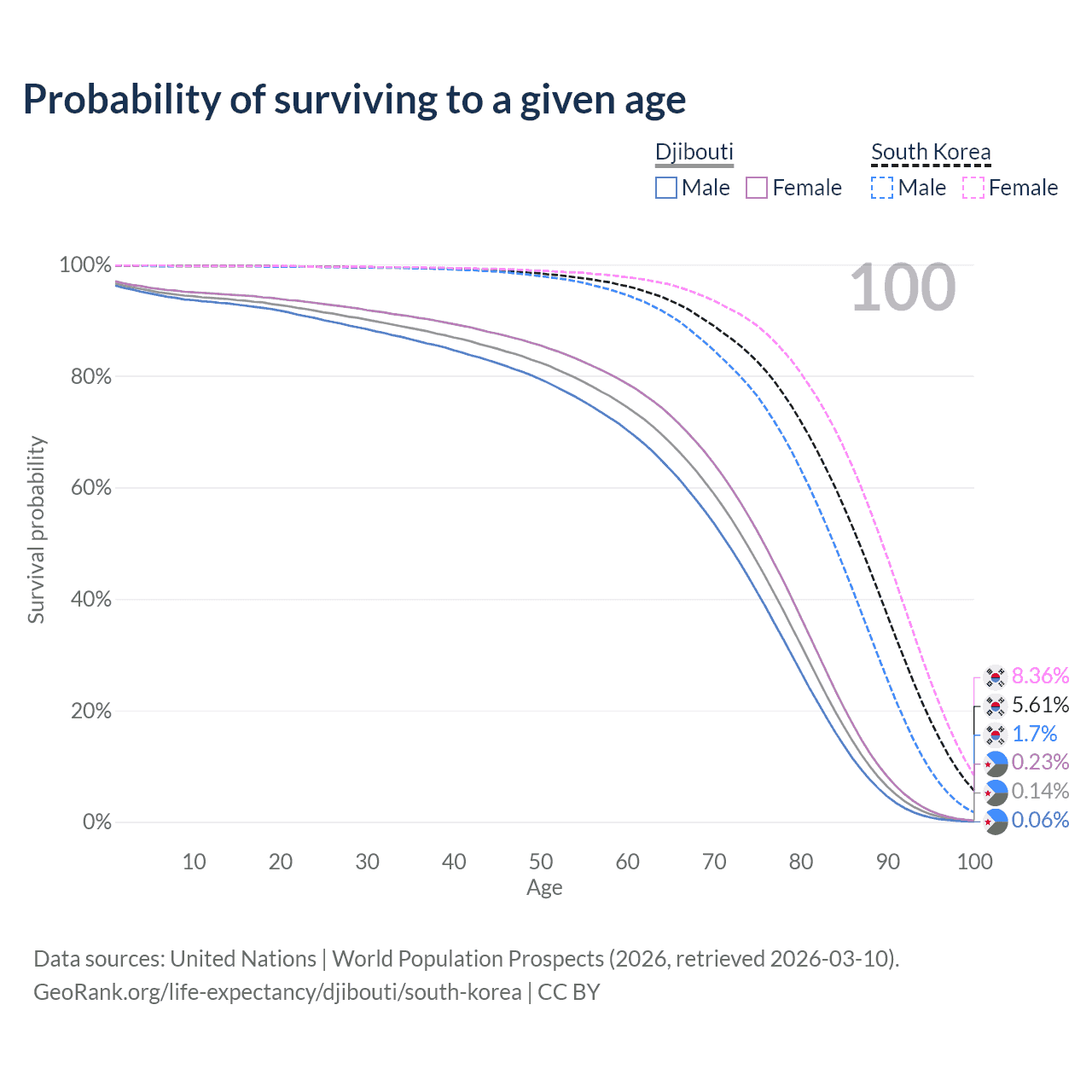 This life expectancy calculator shows the odds of living to 100, 95, 90, and below based on current age for both males and females in Djibouti and South Korea, along with mean and median age of death. The calculations are based on the 2026 life tables (actuarial tables) from the UN World Population Prospects.