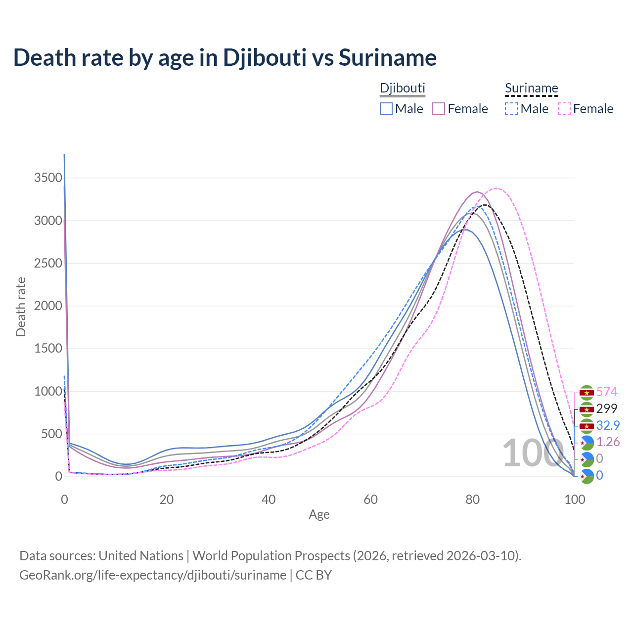 In Djibouti, the most common age of death is 0, compared to 82 in Suriname. The median age of death is 73.7 in Djibouti and 78 in Suriname, meaning only half of each cohort is expected to live past that age.