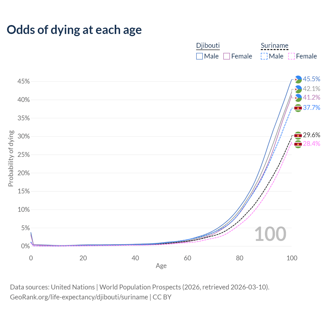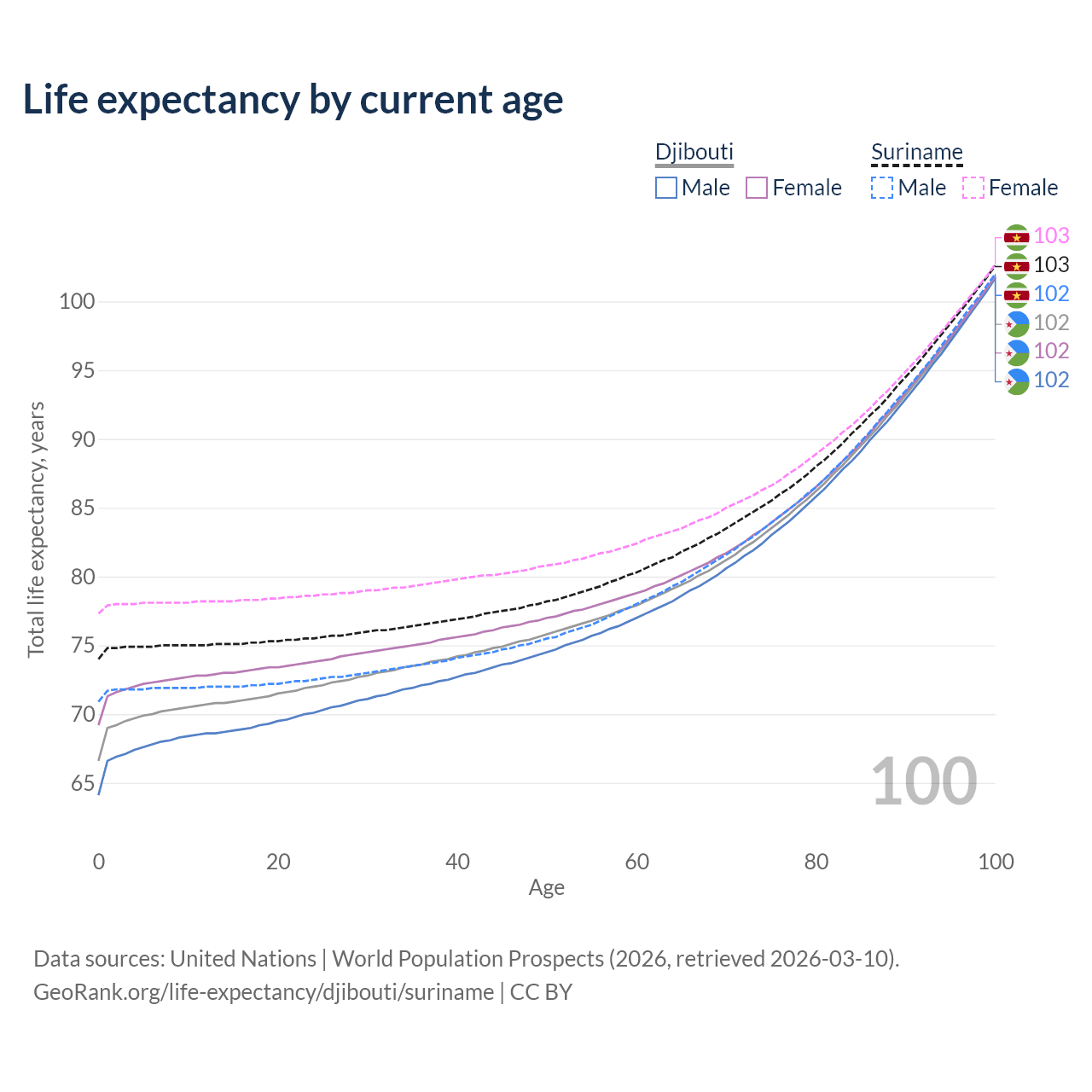 This life expectancy calculator shows the odds of living to 100, 95, 90, and below based on current age for both males and females in Djibouti and Suriname, along with mean and median age of death. The calculations are based on the 2026 life tables (actuarial tables) from the UN World Population Prospects.