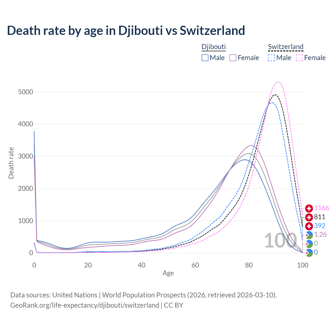 In Djibouti, the most common age of death is 0, compared to 90 in Switzerland. The median age of death is 73.7 in Djibouti and 87.2 in Switzerland, meaning only half of each cohort is expected to live past that age.
