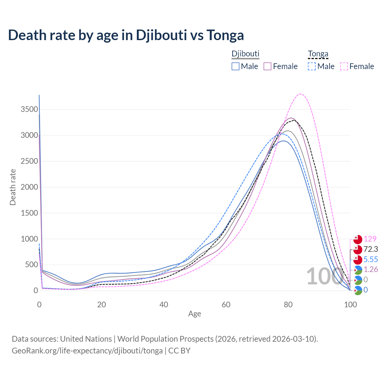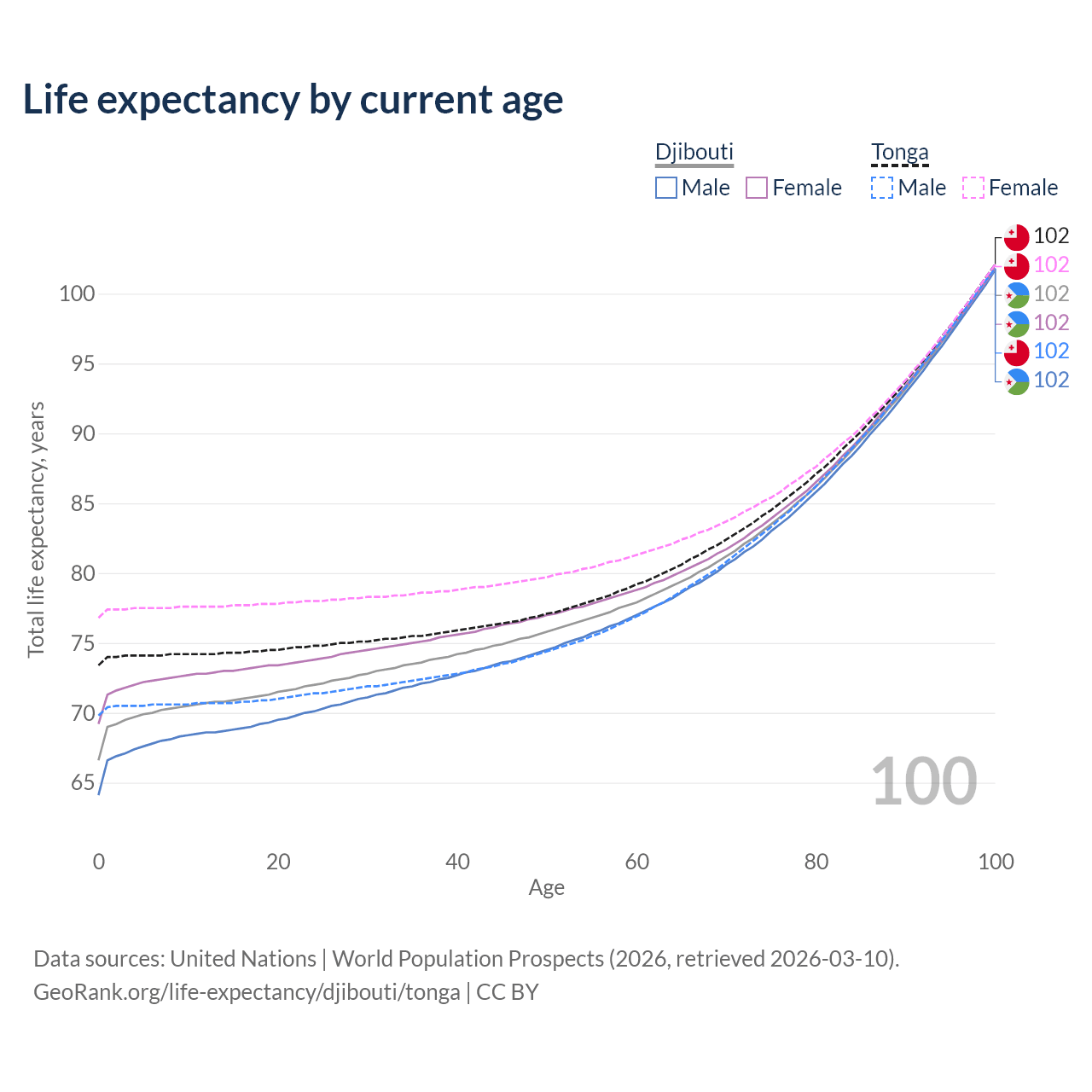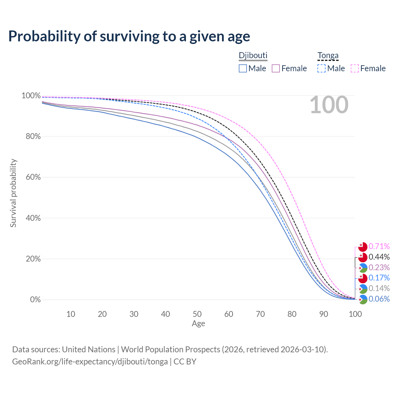 This life expectancy calculator shows the odds of living to 100, 95, 90, and below based on current age for both males and females in Djibouti and Tonga, along with mean and median age of death. The calculations are based on the 2026 life tables (actuarial tables) from the UN World Population Prospects.