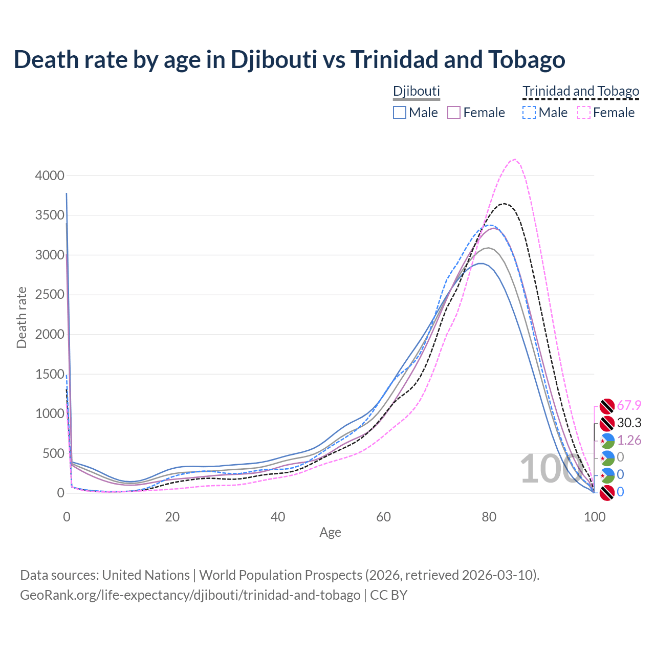 In Djibouti, the most common age of death is 0, compared to 83 in Trinidad and Tobago. The median age of death is 73.7 in Djibouti and 78.4 in Trinidad and Tobago, meaning only half of each cohort is expected to live past that age.