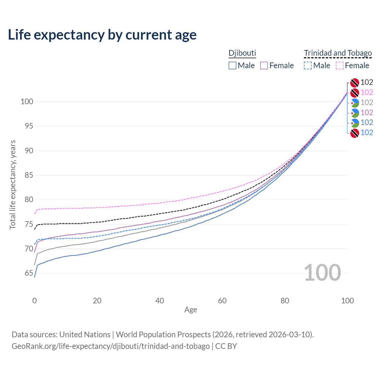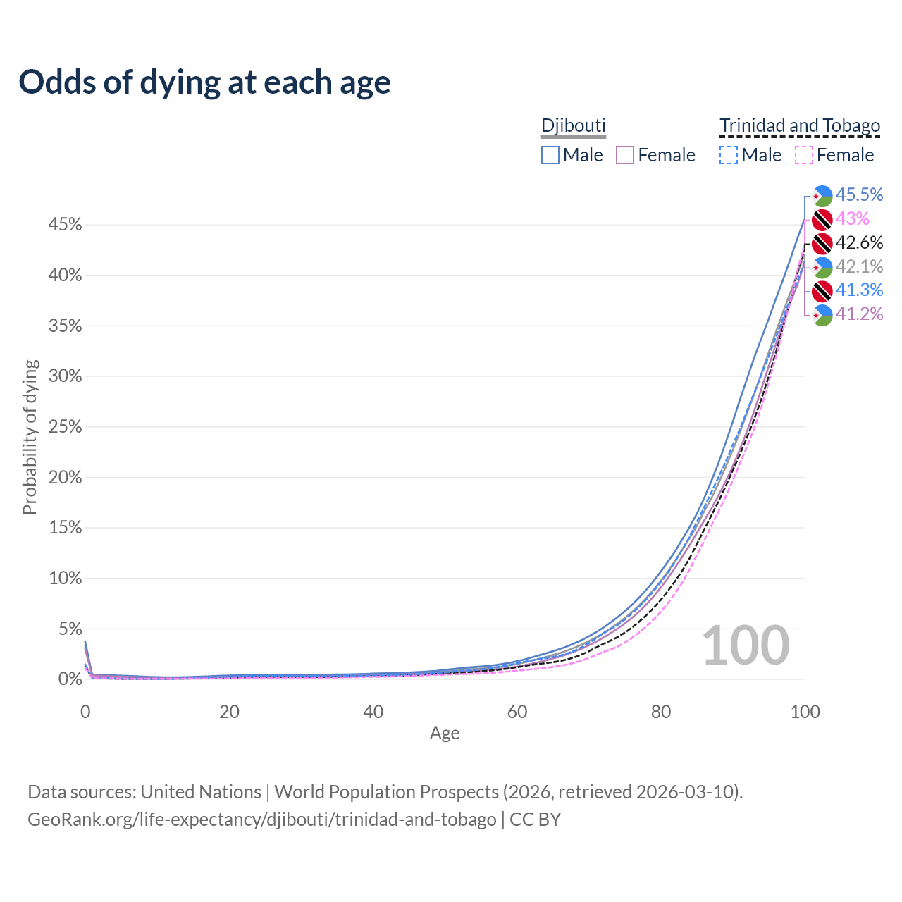 This life expectancy calculator shows the odds of living to 100, 95, 90, and below based on current age for both males and females in Djibouti and Trinidad and Tobago, along with mean and median age of death. The calculations are based on the 2026 life tables (actuarial tables) from the UN World Population Prospects.