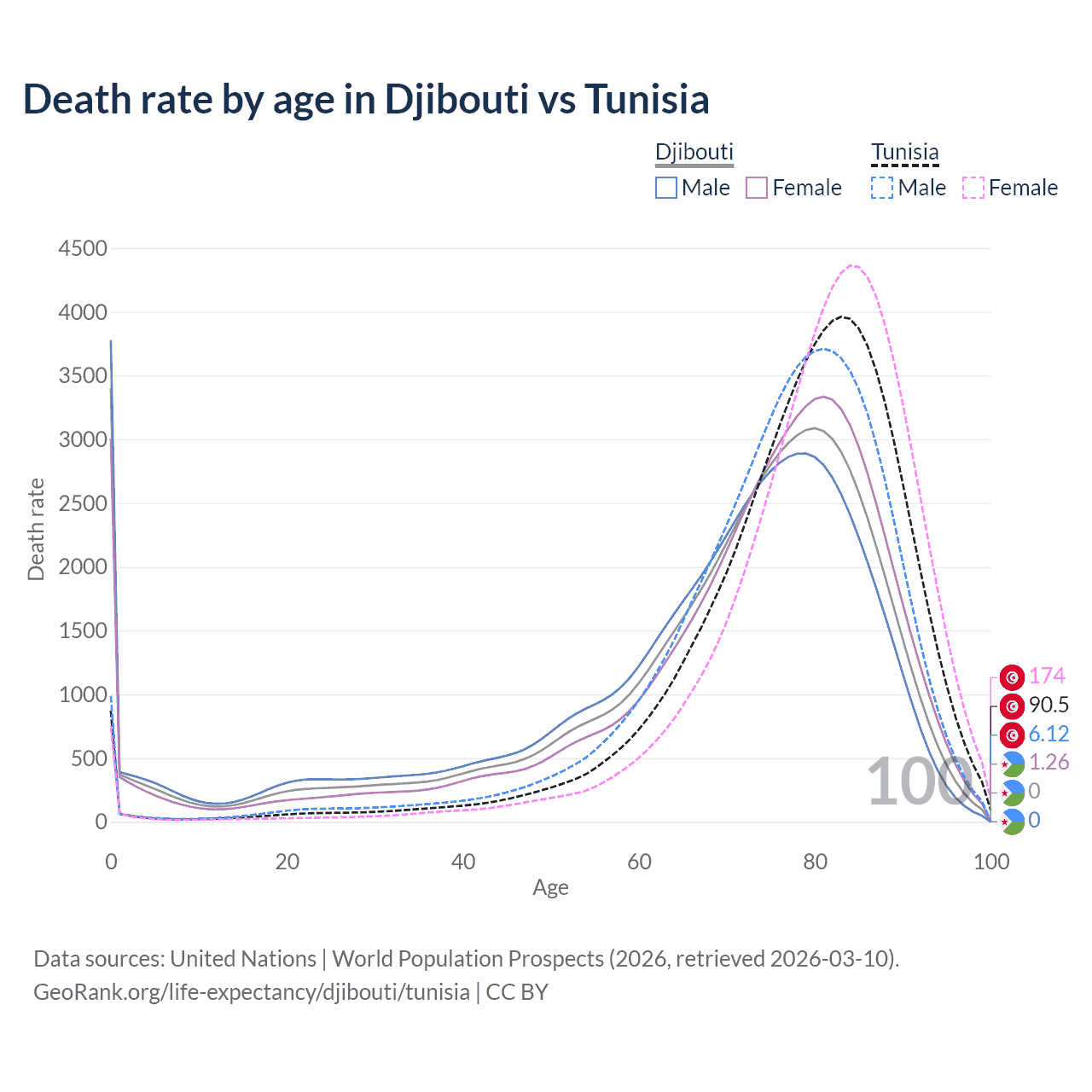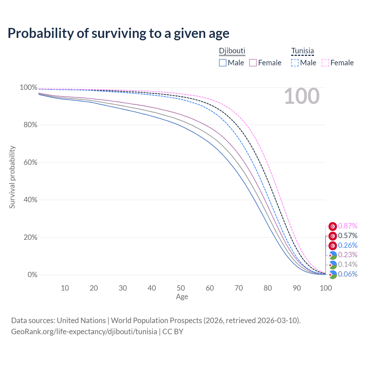 This life expectancy calculator shows the odds of living to 100, 95, 90, and below based on current age for both males and females in Djibouti and Tunisia, along with mean and median age of death. The calculations are based on the 2026 life tables (actuarial tables) from the UN World Population Prospects.