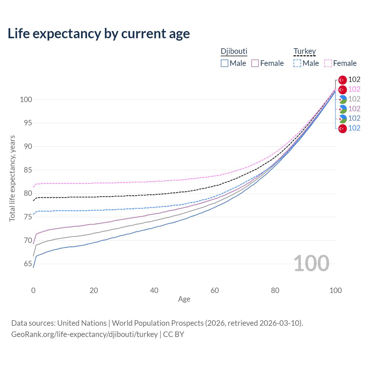 This life expectancy calculator shows the odds of living to 100, 95, 90, and below based on current age for both males and females in Djibouti and Turkey, along with mean and median age of death. The calculations are based on the 2026 life tables (actuarial tables) from the UN World Population Prospects.