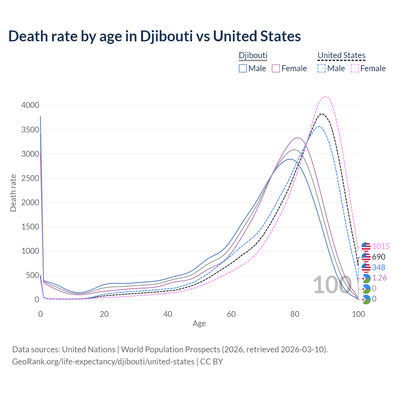 In Djibouti, the most common age of death is 0, compared to 89 in the United States. The median age of death is 73.7 in Djibouti and 83.9 in the United States, meaning only half of each cohort is expected to live past that age.