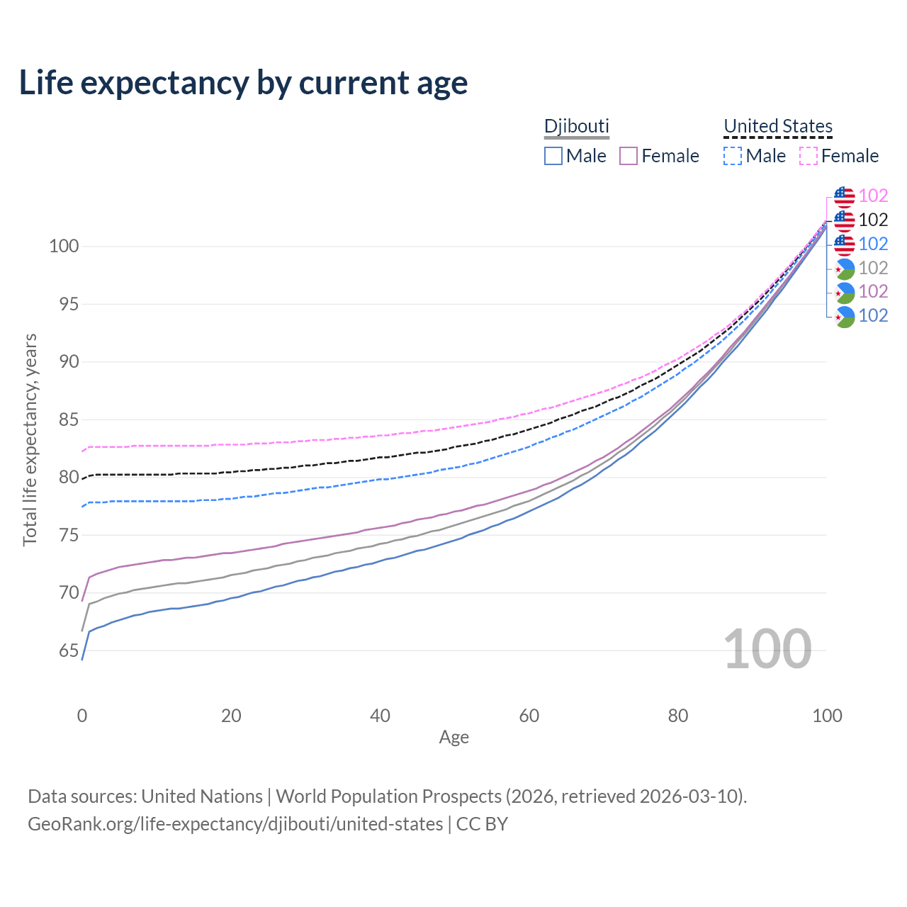 This life expectancy calculator shows the odds of living to 100, 95, 90, and below based on current age for both males and females in Djibouti and the United States, along with mean and median age of death. The calculations are based on the 2026 life tables (actuarial tables) from the UN World Population Prospects.