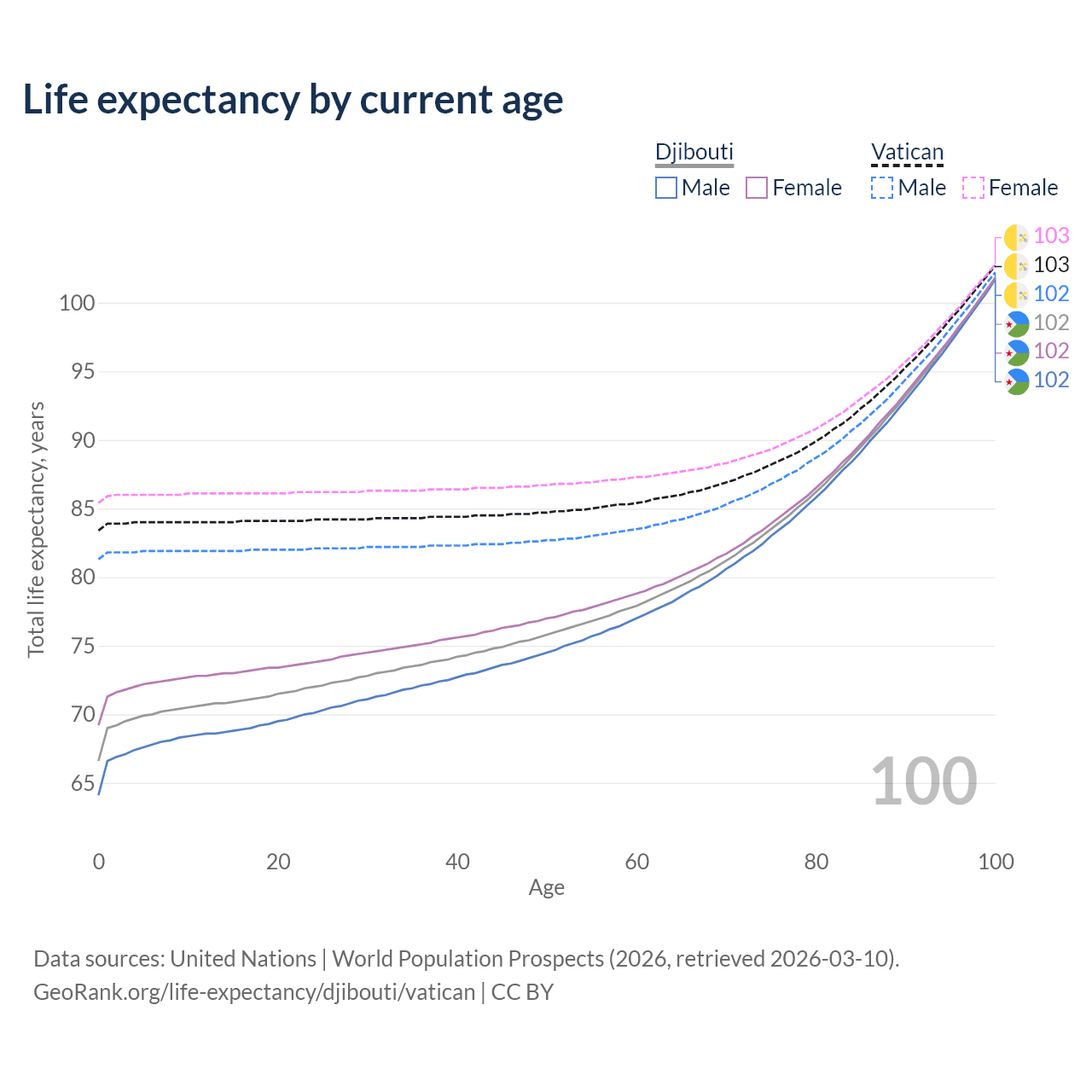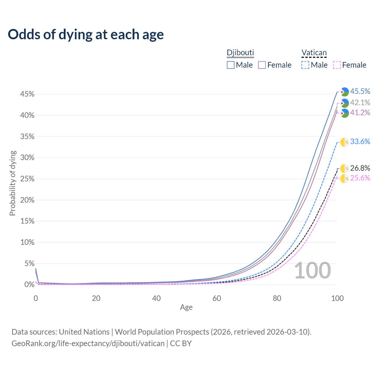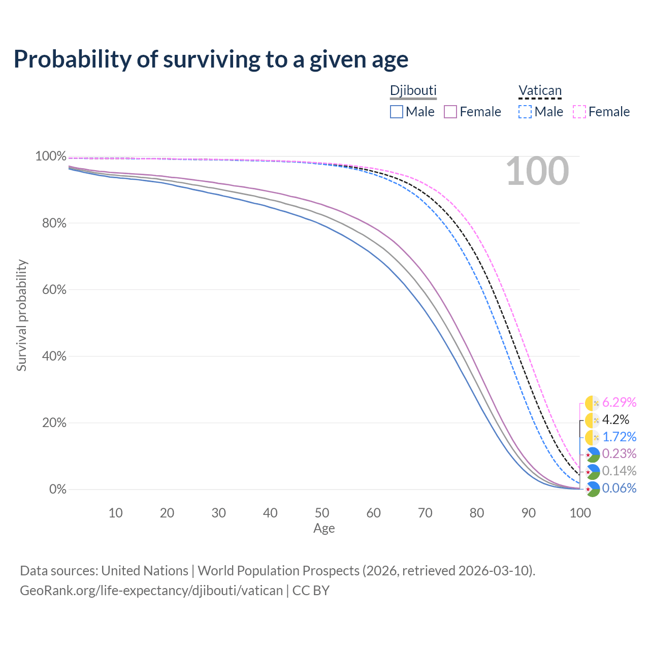This life expectancy calculator shows the odds of living to 100, 95, 90, and below based on current age for both males and females in Djibouti and the Vatican, along with mean and median age of death. The calculations are based on the 2026 life tables (actuarial tables) from the UN World Population Prospects.