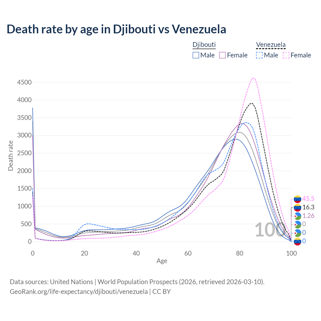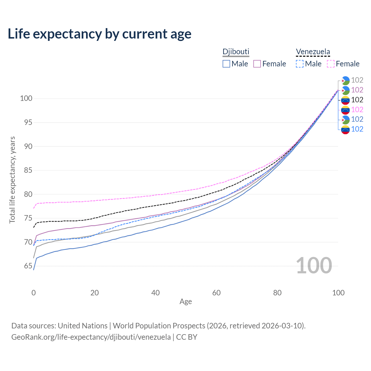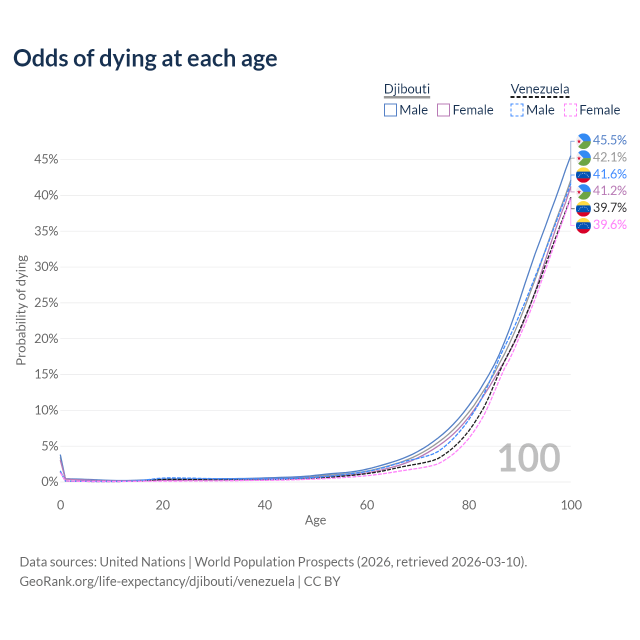 This life expectancy calculator shows the odds of living to 100, 95, 90, and below based on current age for both males and females in Djibouti and Venezuela, along with mean and median age of death. The calculations are based on the 2026 life tables (actuarial tables) from the UN World Population Prospects.