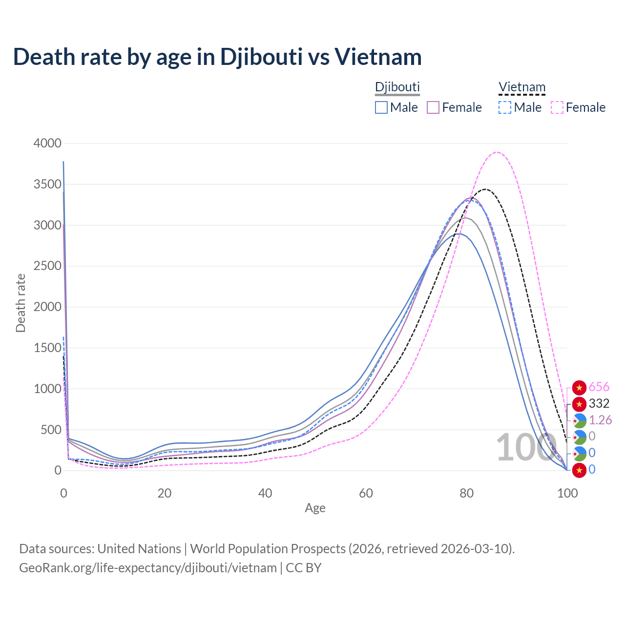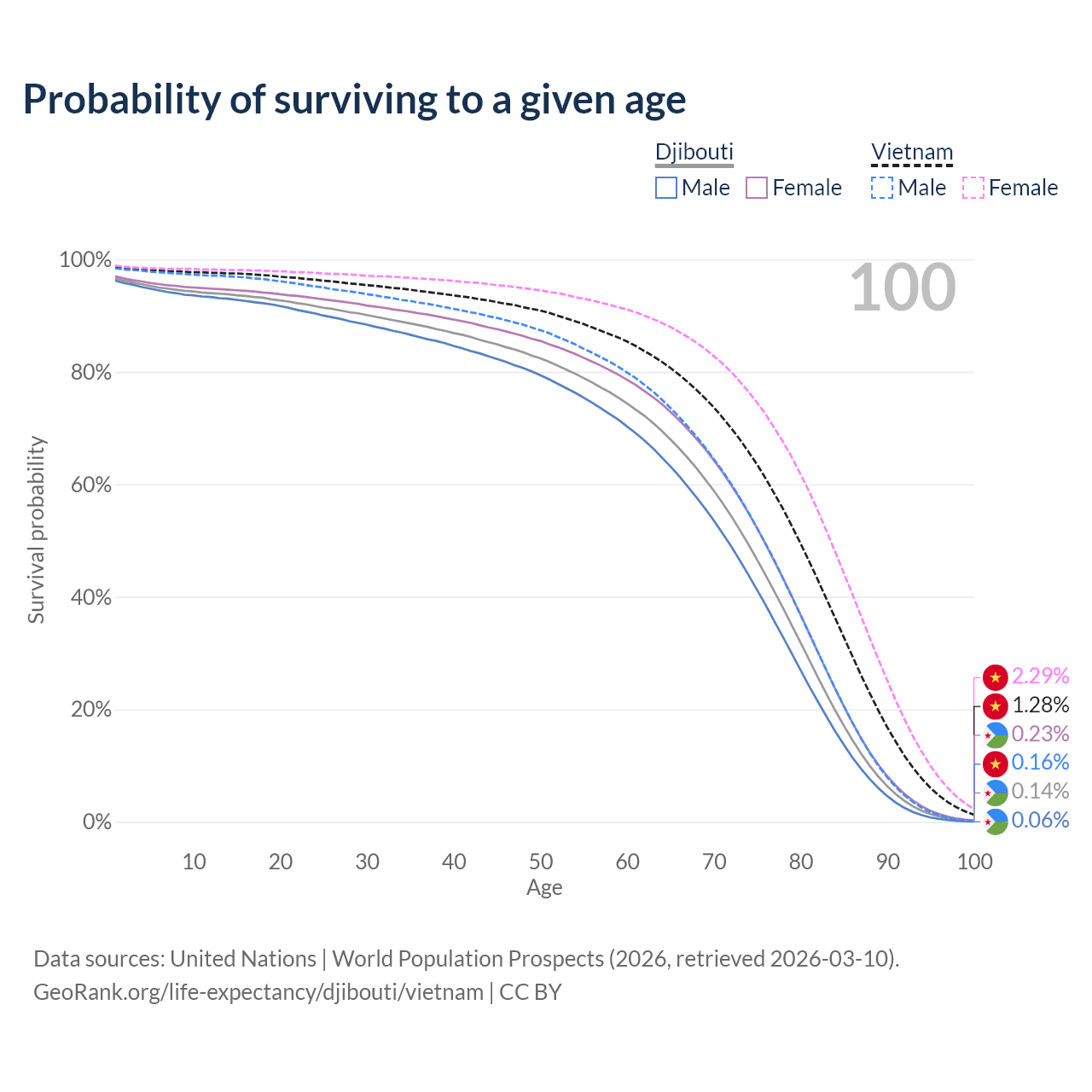 This life expectancy calculator shows the odds of living to 100, 95, 90, and below based on current age for both males and females in Djibouti and Vietnam, along with mean and median age of death. The calculations are based on the 2026 life tables (actuarial tables) from the UN World Population Prospects.