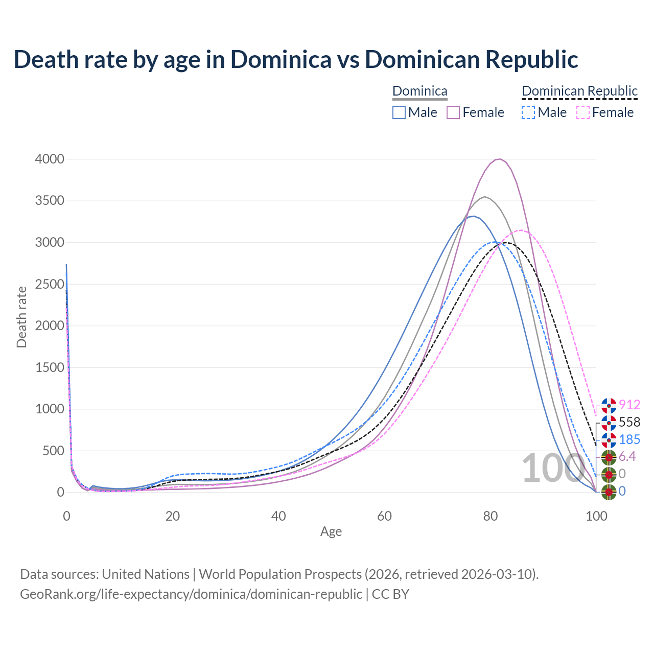 In Dominica, the most common age of death is 79, compared to 83 in the Dominican Republic. The median age of death is 75.9 in Dominica and 78.9 in the Dominican Republic, meaning only half of each cohort is expected to live past that age.
